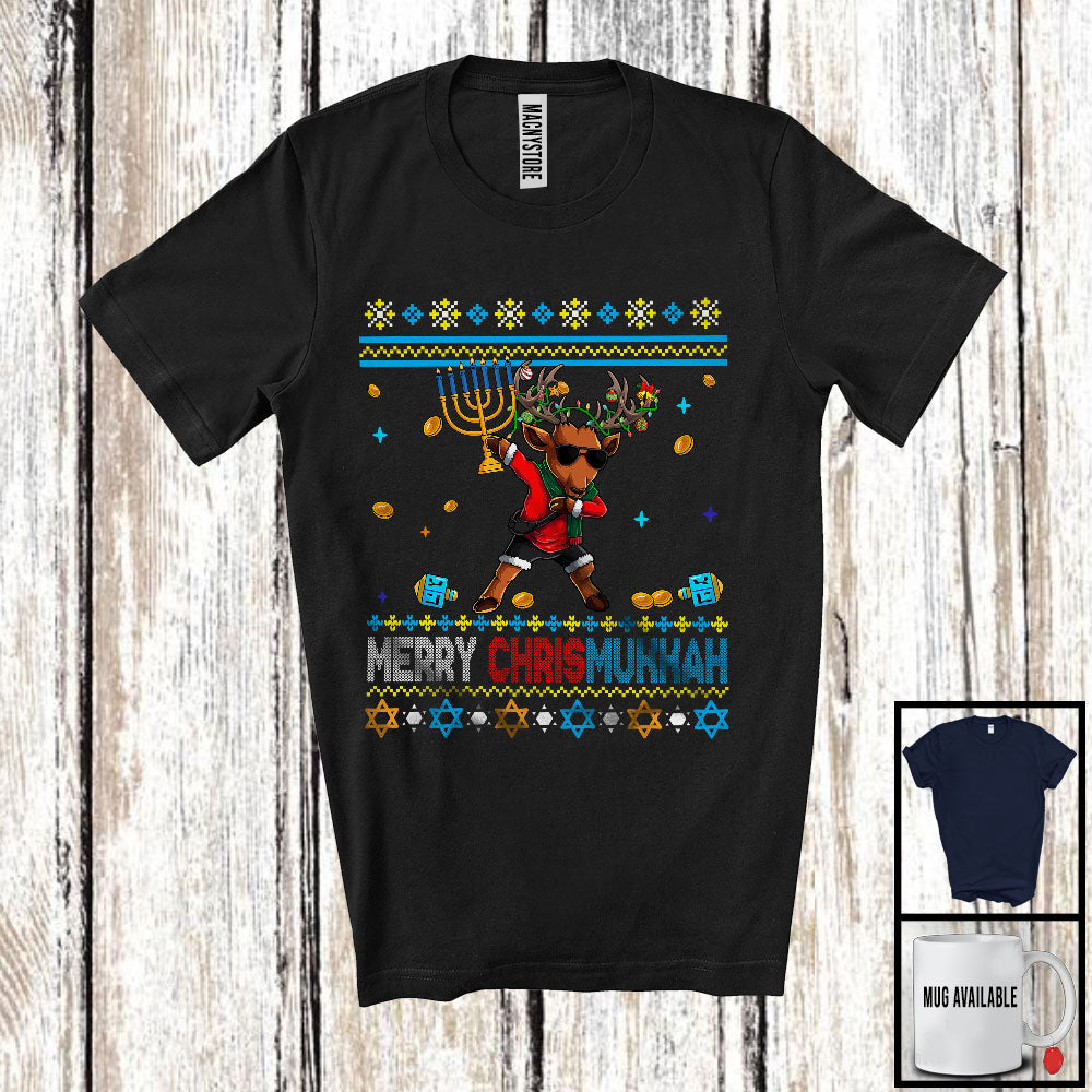 Merry Chrismukkah; Joyful Christmas Hanukkah Sweater Dabbing Reindeer; Holding Menorah Family T-Shirt. This cotton t-shirt is a durable staple product with a classic fit. One of the most popular items, it has a relaxed style made for everyday and casual wear.