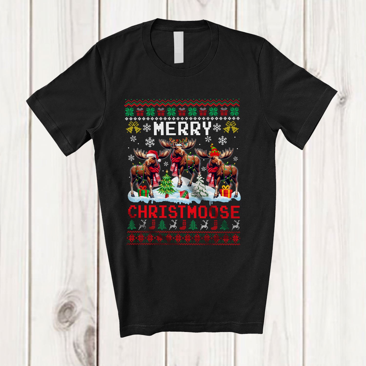Merry Christmoose; Adorable Christmas Sweater Santa Reindeer Elf Moose; X-mas Lights T-Shirt