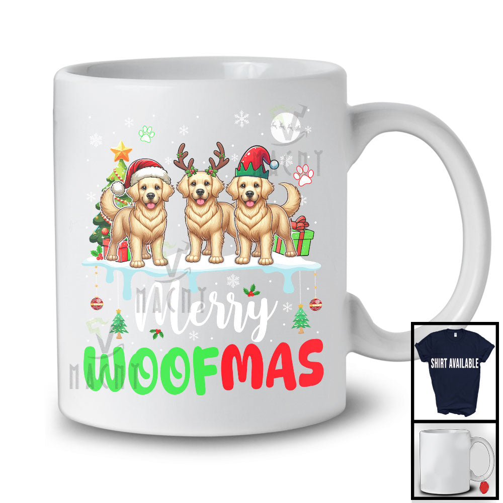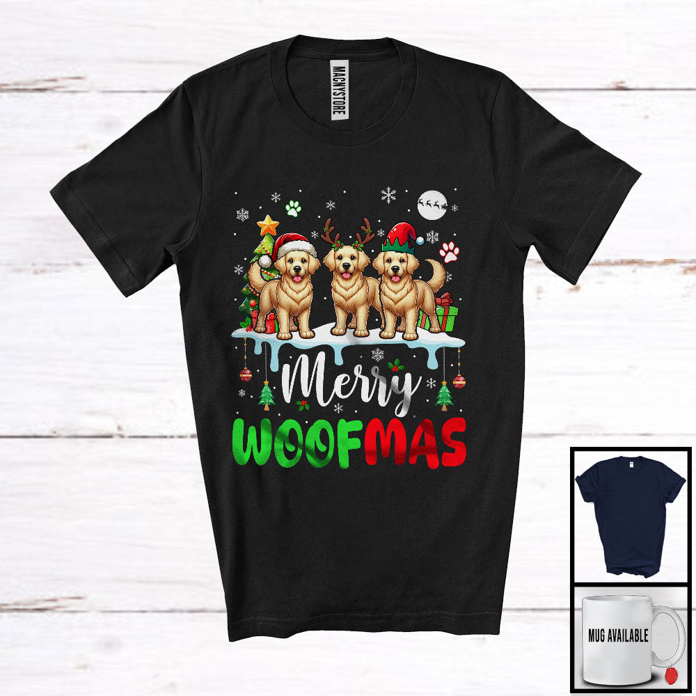 Merry Woofmas; Lovely Christmas Three Reindeer Elf Santa Golden Retriever Owner; Snowing T-Shirt