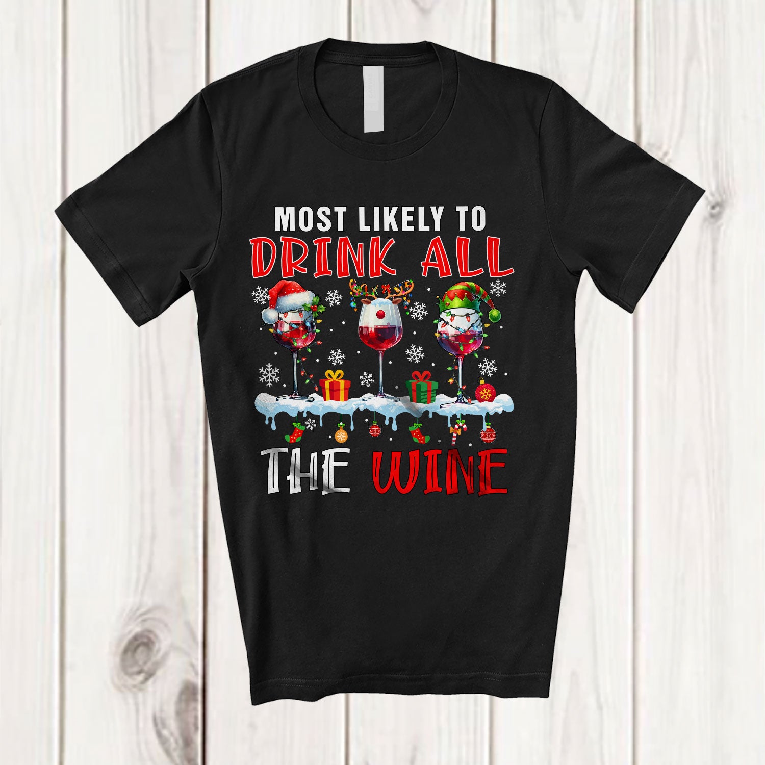 Most Likely To Drink All The Wine; Humorous Christmas Naughty Santa Wine; Drinking T-Shirt. This cotton t-shirt is a durable staple product with a classic fit. One of the most popular items, it has a relaxed style made for everyday and casual wear.