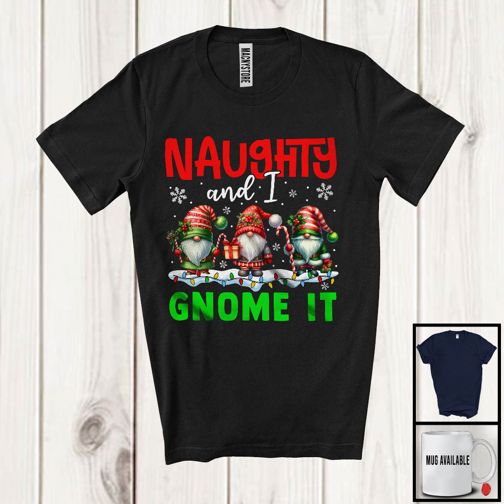 Naughty And I Gnome It; Humorous Christmas Three Gnomes Gnomies X-mas Lights; Family T-Shirt. This cotton t-shirt is a durable staple product with a classic fit. One of the most popular items, it has a relaxed style made for everyday and casual wear.