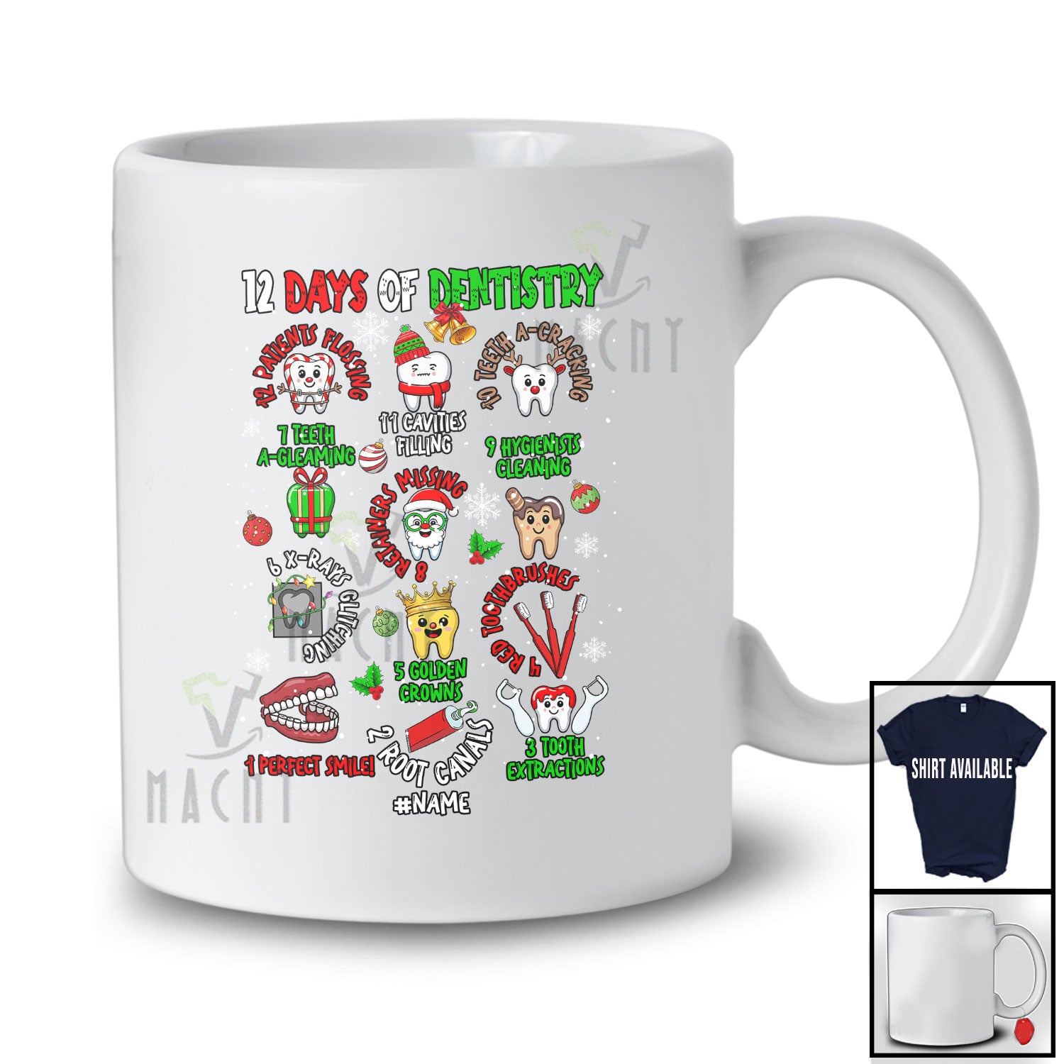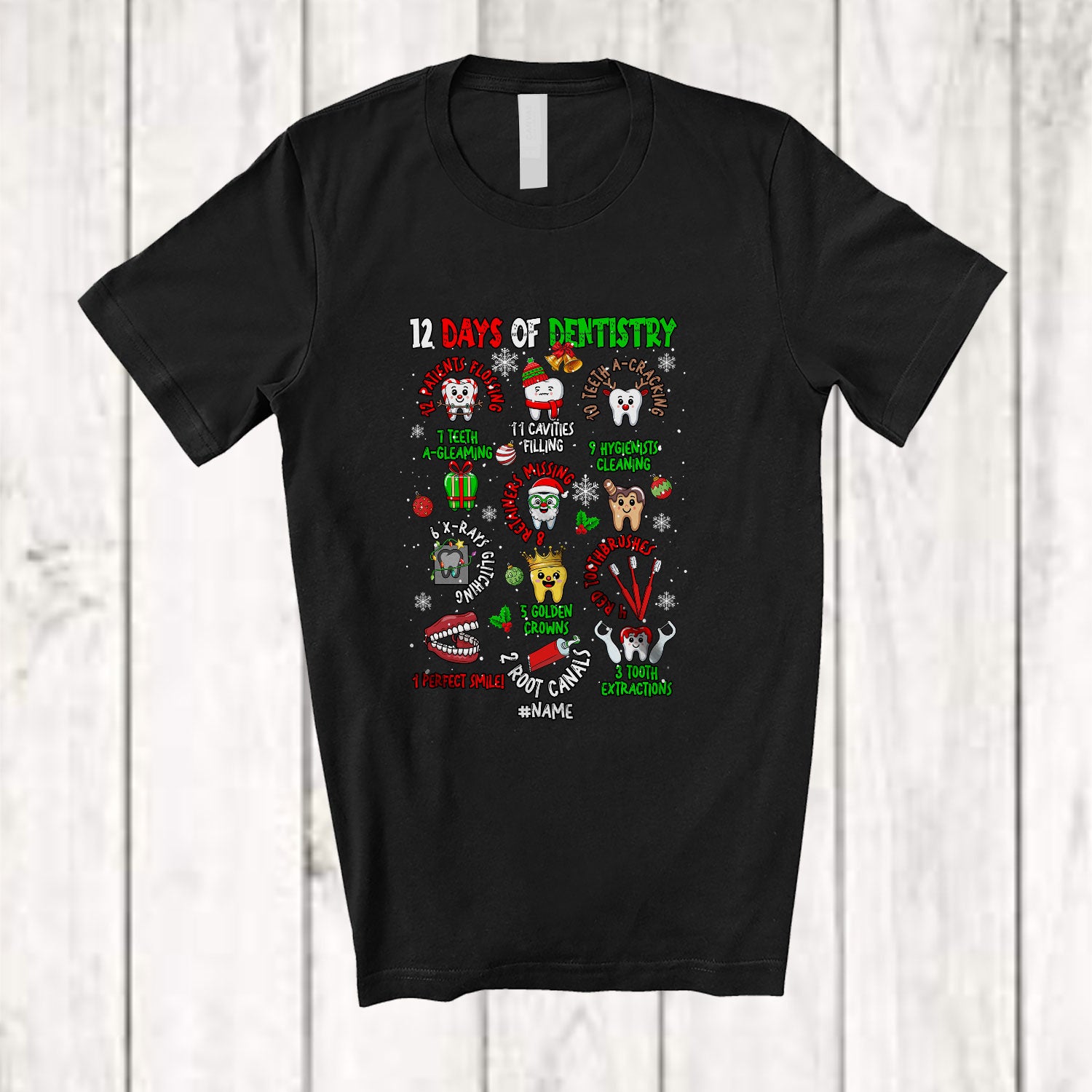 • Personalized Custom Name 12 Days Of Dentistry; Lovely Christmas Teeth; Assistant Dental Dentist T-Shirt. This cotton t-shirt is a durable staple product with a classic fit. One of the most popular items, it has a relaxed style made for everyday and casual wear.