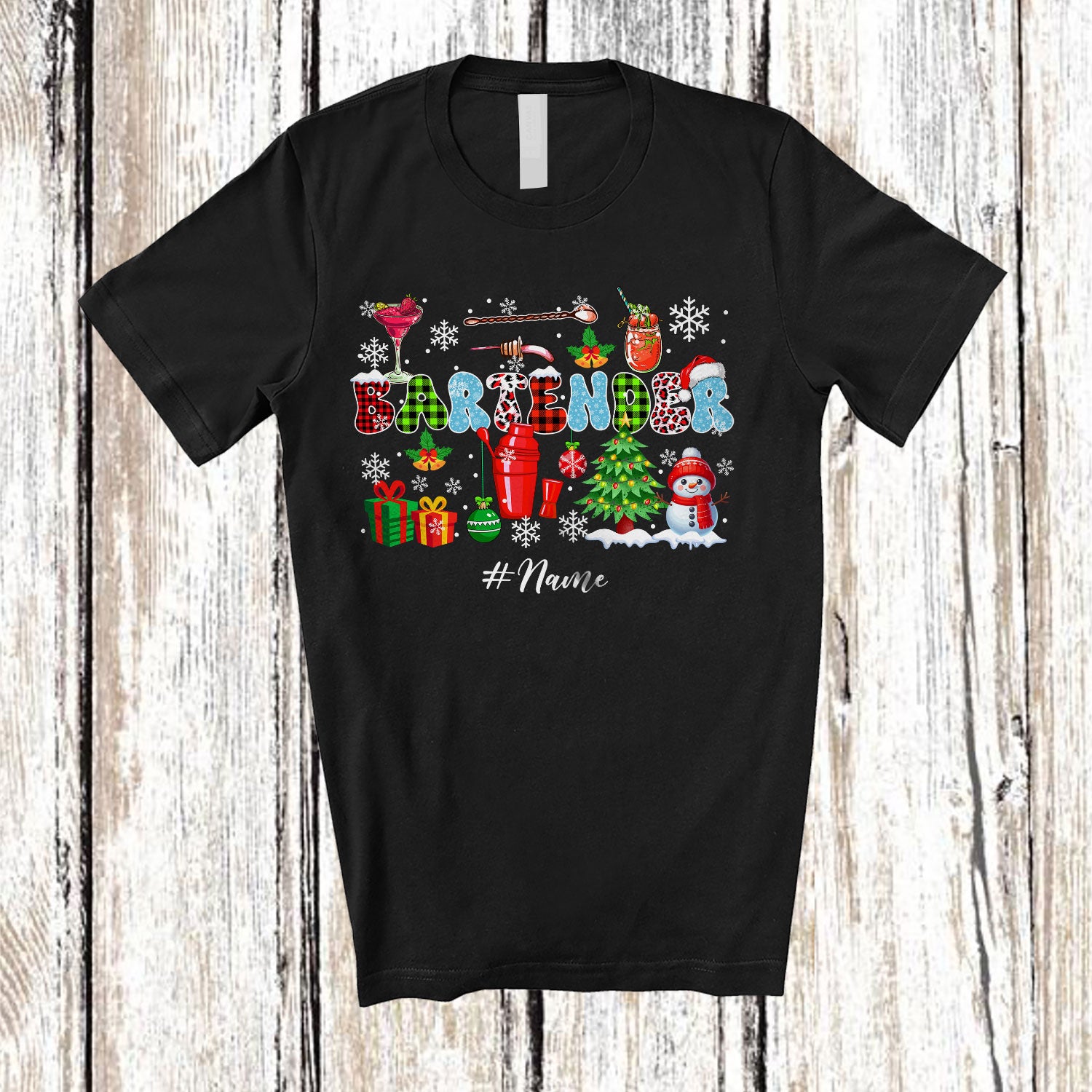 Personalized Custom Name Bartender; Joyful Christmas Cosplay Snowing Leopard Plaid T-Shirt. This cotton t-shirt is a durable staple product with a classic fit. One of the most popular items, it has a relaxed style made for everyday and casual wear.