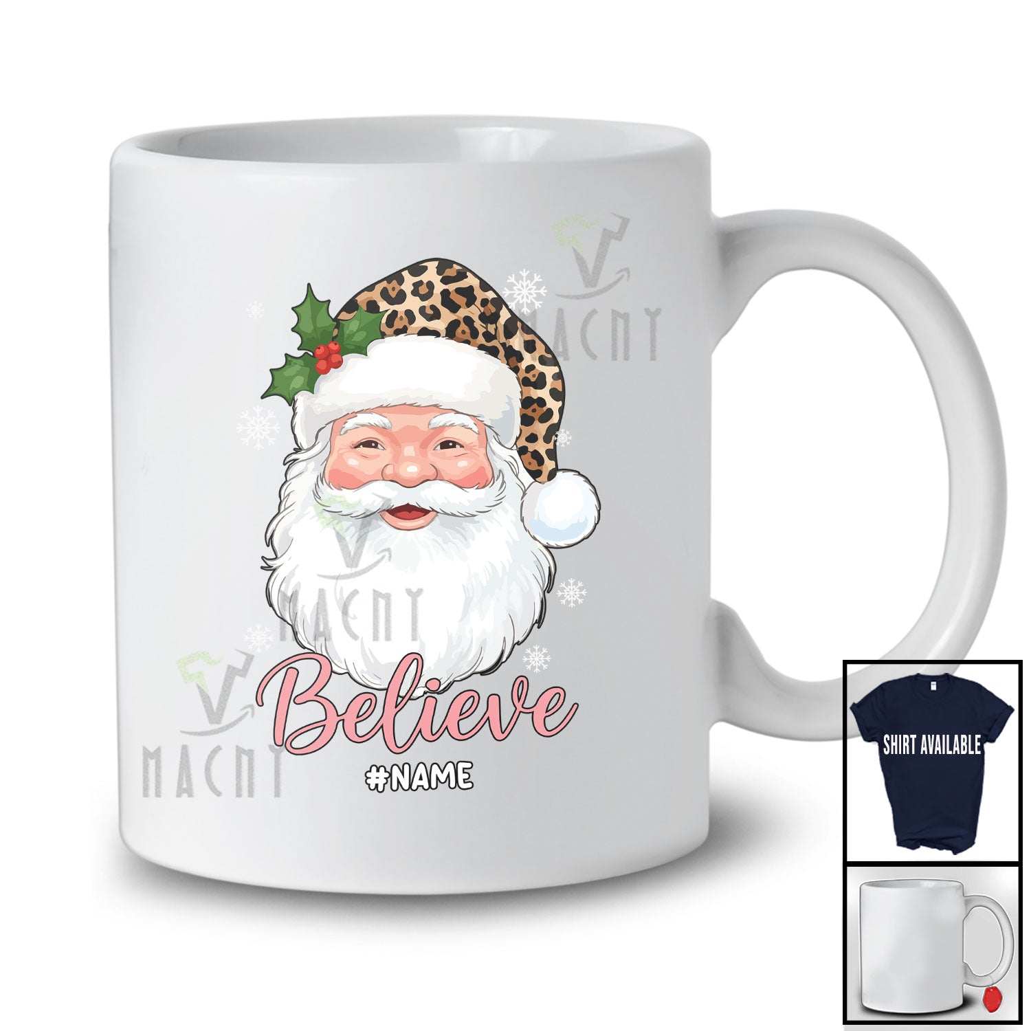 Personalized Custom Name Believe; Awesome Christmas Leopard Santa Face; Pajama Family T-Shirt. This cotton t-shirt is a durable staple product with a classic fit. One of the most popular items, it has a relaxed style made for everyday and casual wear.