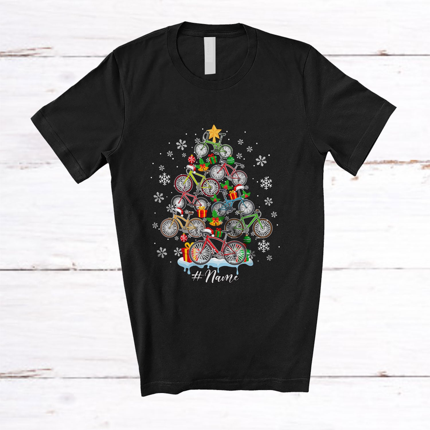 Personalized Custom Name Bicycle Santa Christmas Tree; Joyful Bicycle Rider; Boys Family T-Shirt. This cotton t-shirt is a durable staple product with a classic fit. One of the most popular items, it has a relaxed style made for everyday and casual wear.