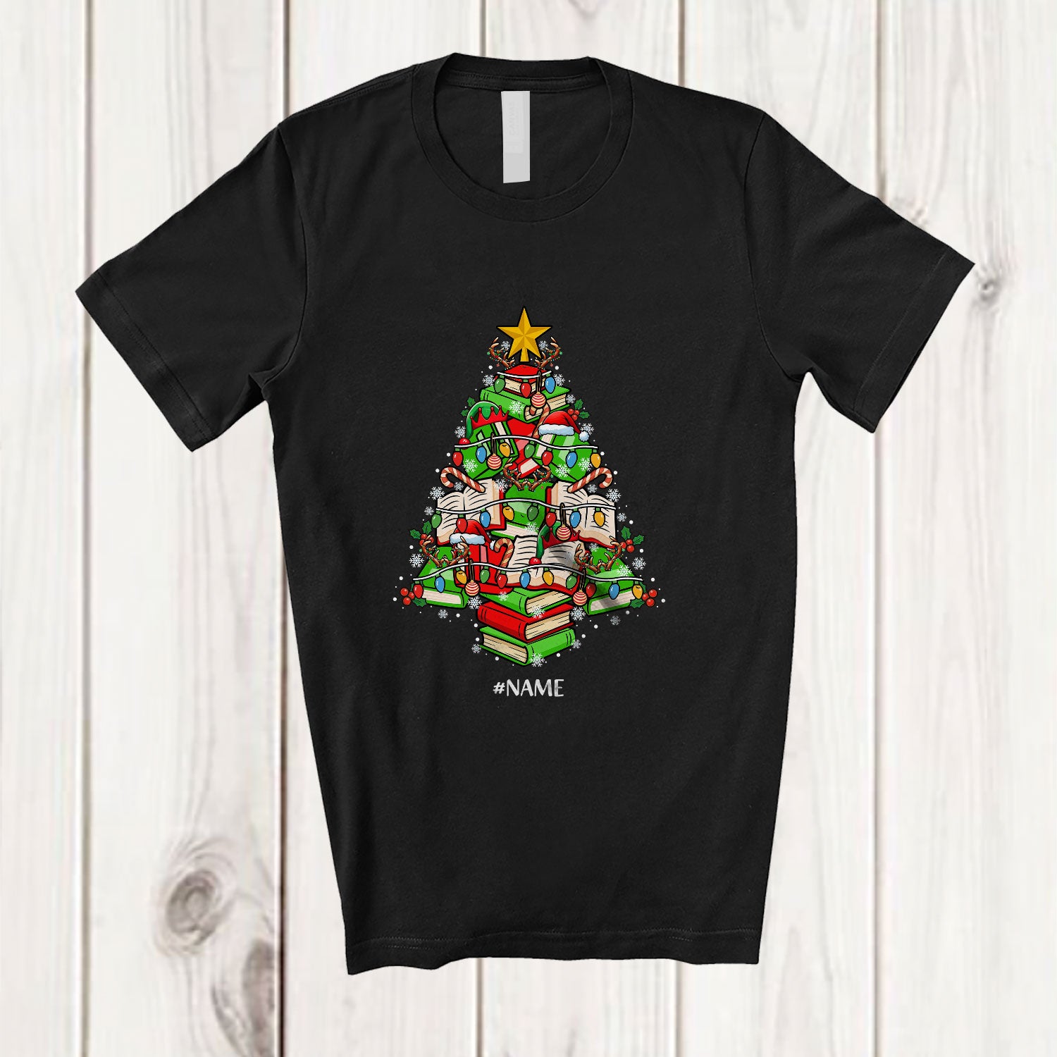 Personalized Custom Name Books Christmas Tree; Adorable Book Nerd; Librarian Teacher T-Shirt. This cotton t-shirt is a durable staple product with a classic fit. One of the most popular items, it has a relaxed style made for everyday and casual wear.