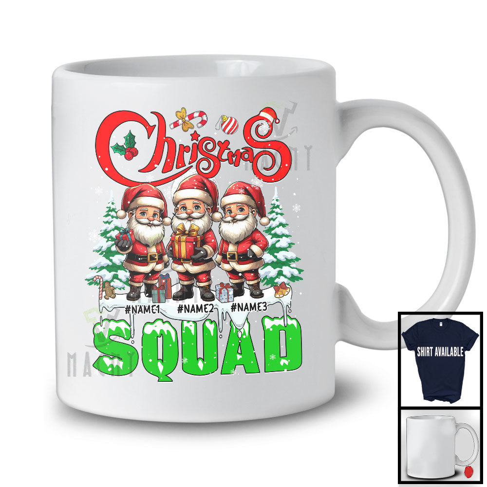 Personalized Custom Name Christmas Squad; Adorable X-mas Tree Three Santa; Family Group T-Shirt. This cotton t-shirt is a durable staple product with a classic fit. One of the most popular items, it has a relaxed style made for everyday and casual wear.