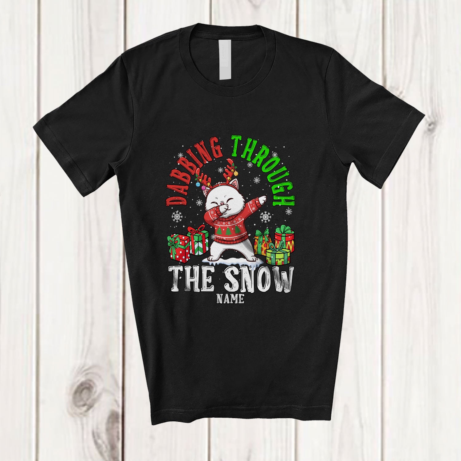 Personalized Custom Name Dabbing Through The Snow; Cheerful Christmas Reindeer Cat Owner T-Shirt