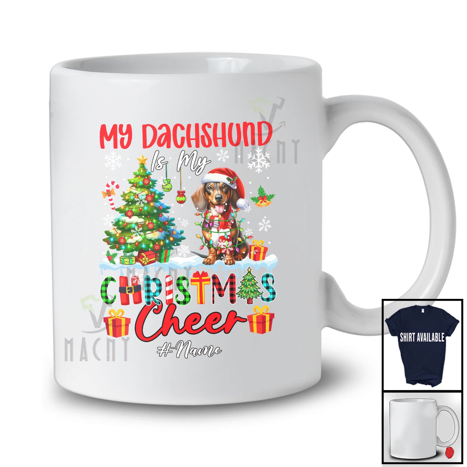 • Personalized Custom Name Dachshund Is My Christmas Cheer; Lovely Plaid Tree Lights Santa T-Shirt. This cotton t-shirt is a durable staple product with a classic fit. One of the most popular items, it has a relaxed style made for everyday and casual wear.