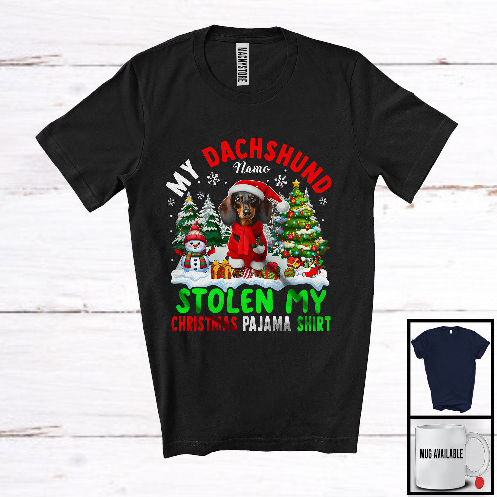 • Personalized Custom Name Dachshund Stolen My Christmas Pajama Shirt; Cool X-mas Tree Snow T-Shirt. This cotton t-shirt is a durable staple product with a classic fit. One of the most popular items, it has a relaxed style made for everyday and casual wear.