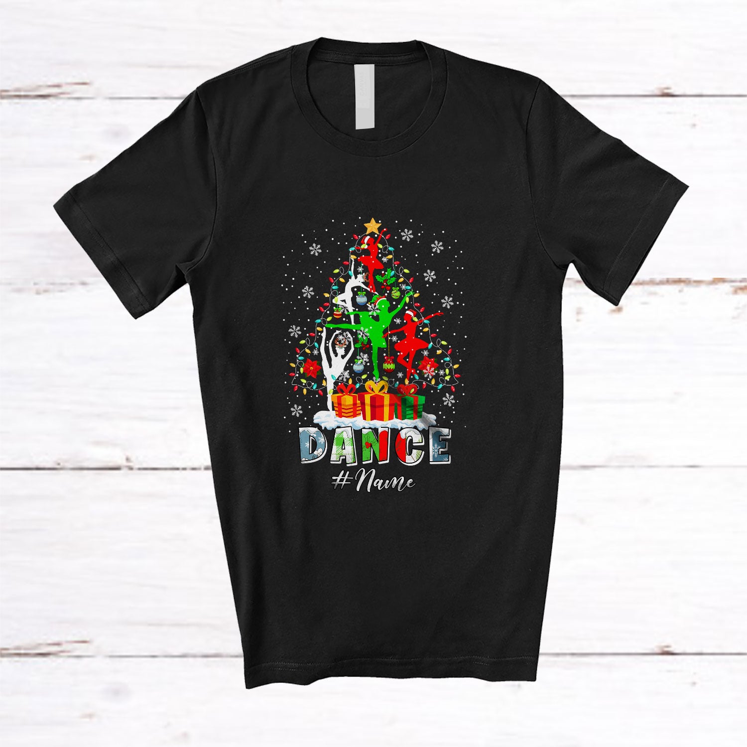 Personalized Custom Name Dance Christmas Tree; Colorful X-mas Lights Teacher Students T-Shirt. This cotton t-shirt is a durable staple product with a classic fit. One of the most popular items, it has a relaxed style made for everyday and casual wear.