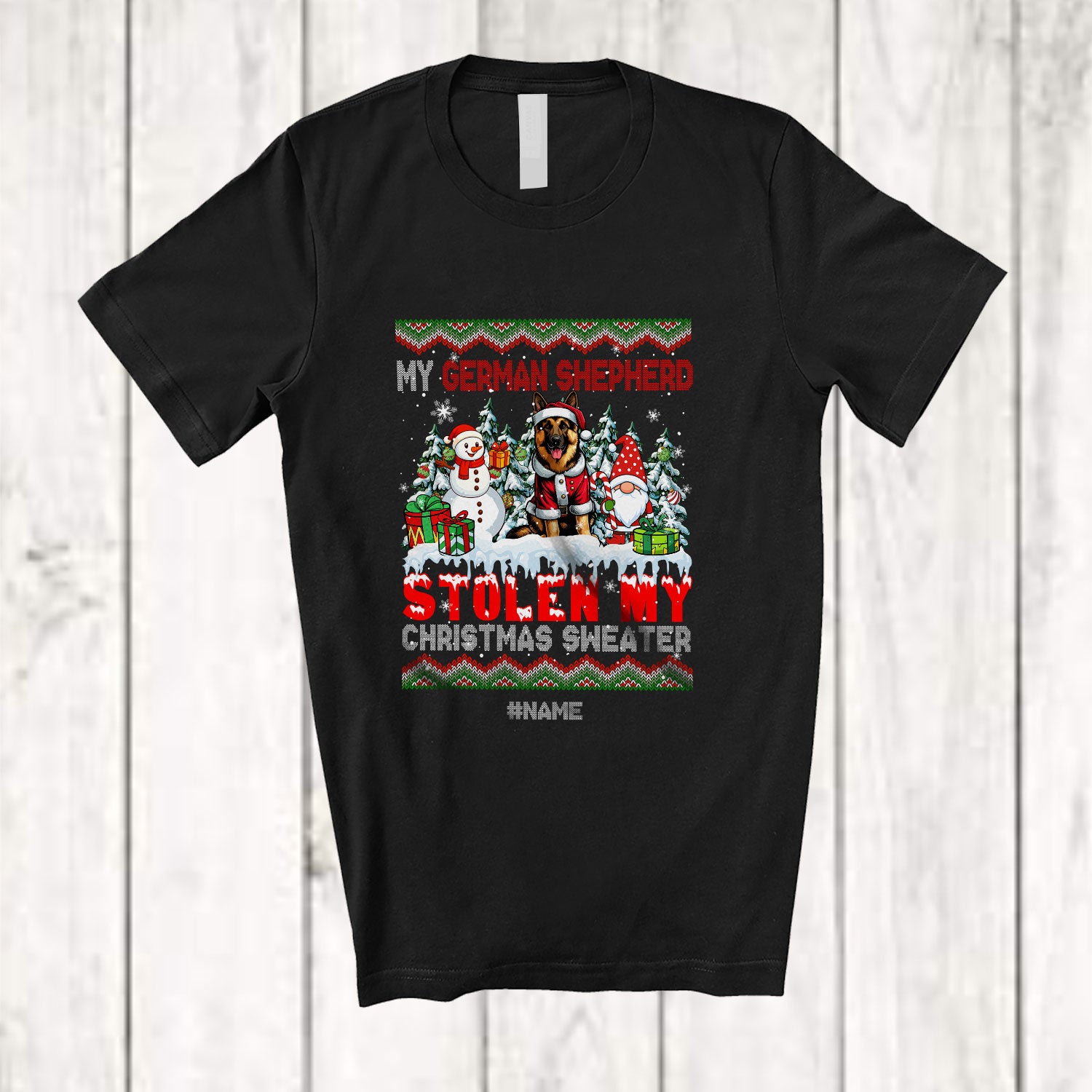 • Personalized Custom Name German Shepherd Stolen My Christmas Sweater; Lovely Santa Gnome T-Shirt. This cotton t-shirt is a durable staple product with a classic fit. One of the most popular items, it has a relaxed style made for everyday and casual wear.