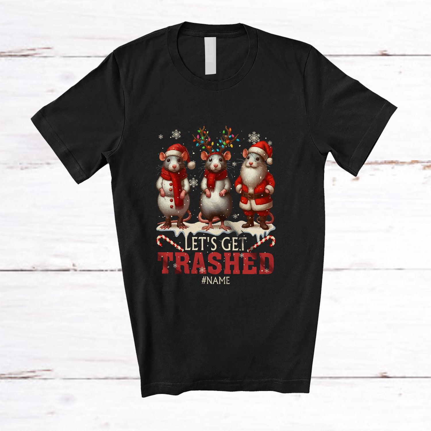 • Personalized Custom Name Get Trashed; Lovely Christmas Three Snowman Santa Rat Trash T-Shirt. This cotton t-shirt is a durable staple product with a classic fit. One of the most popular items, it has a relaxed style made for everyday and casual wear.