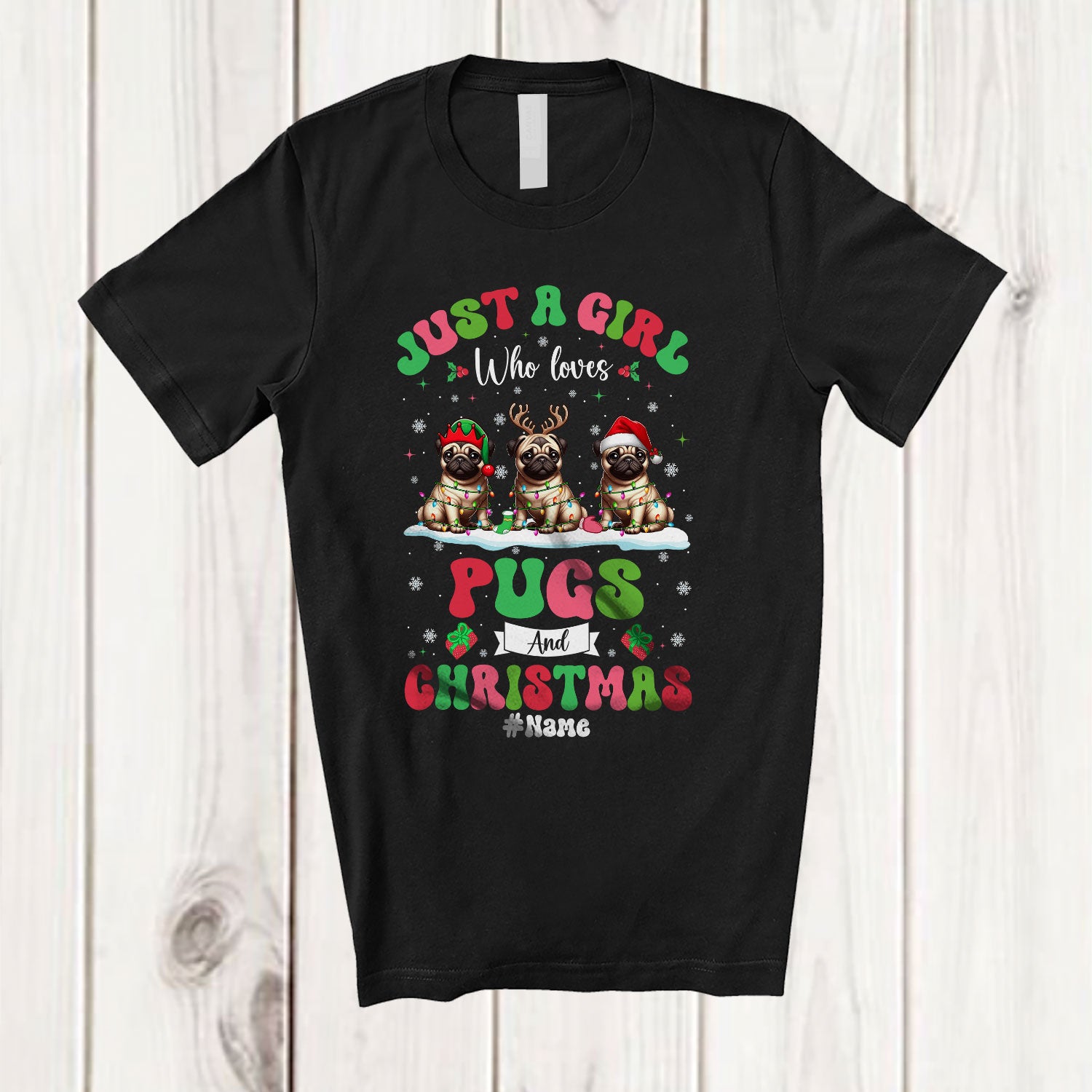 Personalized Custom Name Girl Who Loves Pugs Christmas; Amazing X-mas Snow Lights T-Shirt