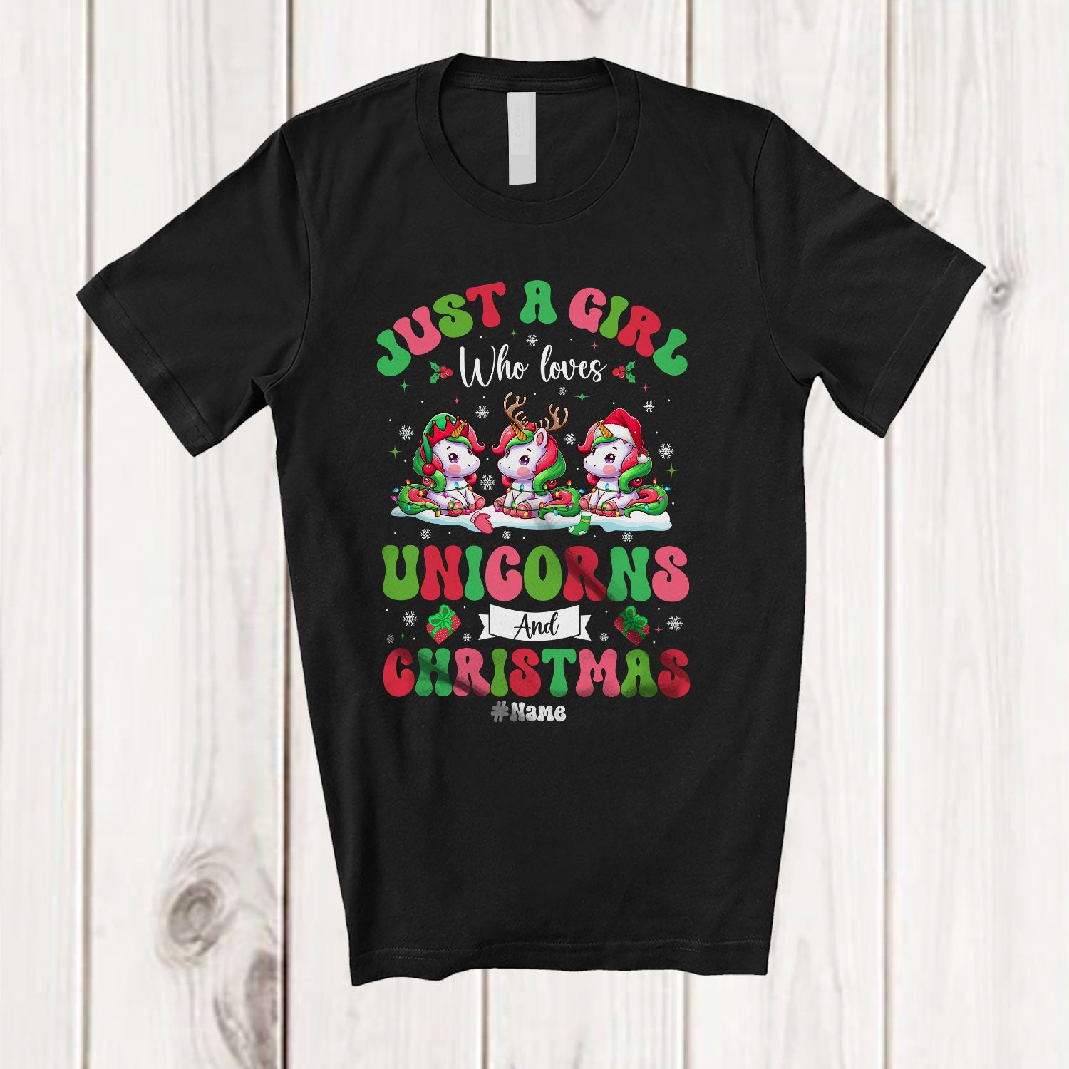 Personalized Custom Name Girl Who Loves Unicorns Christmas; Amazing X-mas Snow Lights T-Shirt. This cotton t-shirt is a durable staple product with a classic fit. One of the most popular items, it has a relaxed style made for everyday and casual wear.