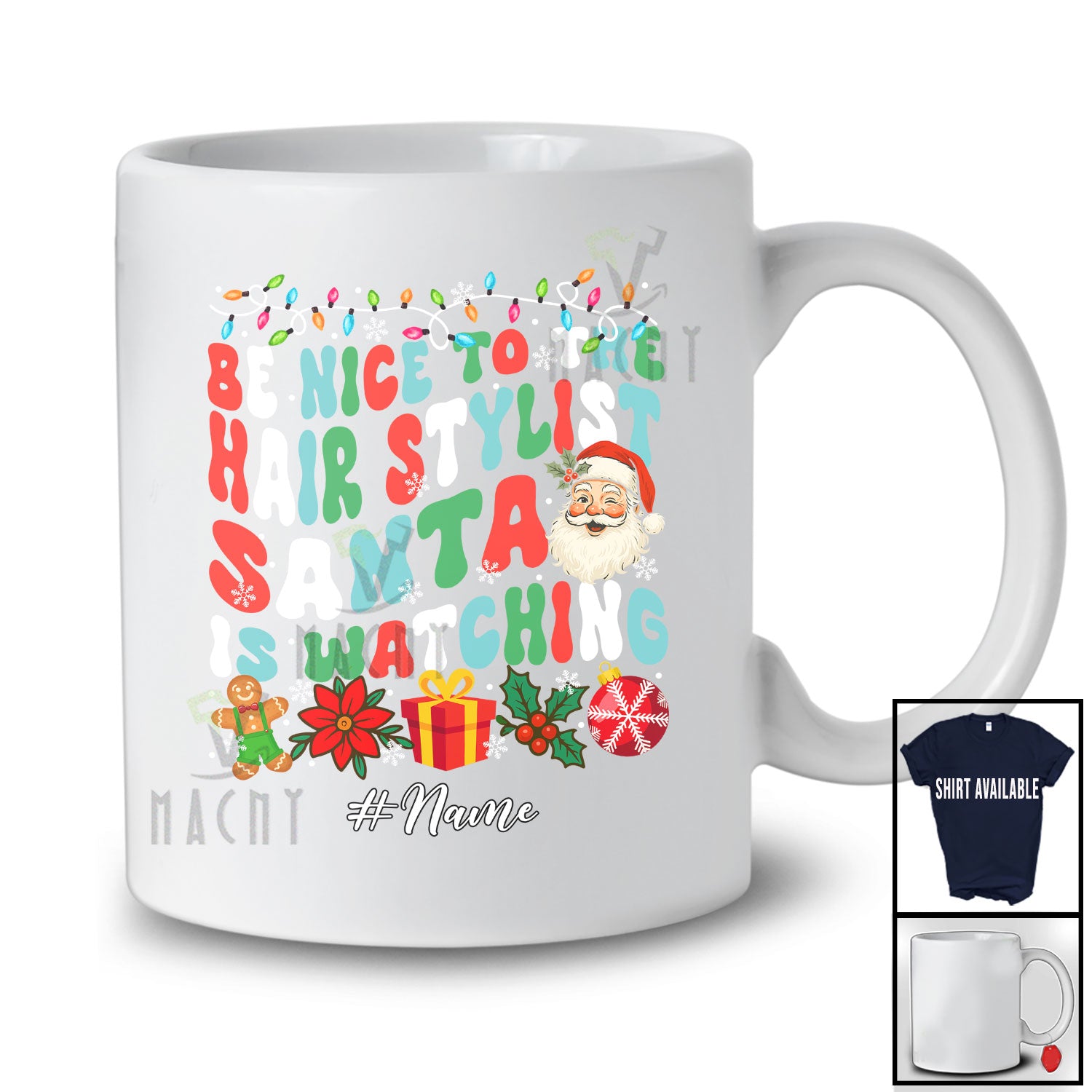 This Personalized Custom Name Nice To Hair Stylist Santa Watching; Lovely Christmas Groovy Jobs T-Shirt is great idea gift for your family, friends in this birthday, christmas, mother's day, father's day, patrick's day or any holiday.