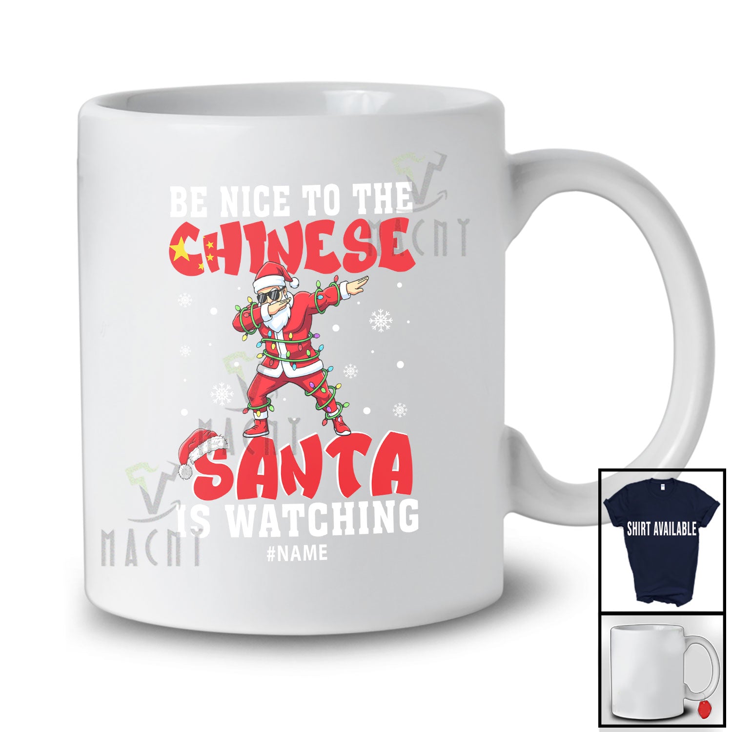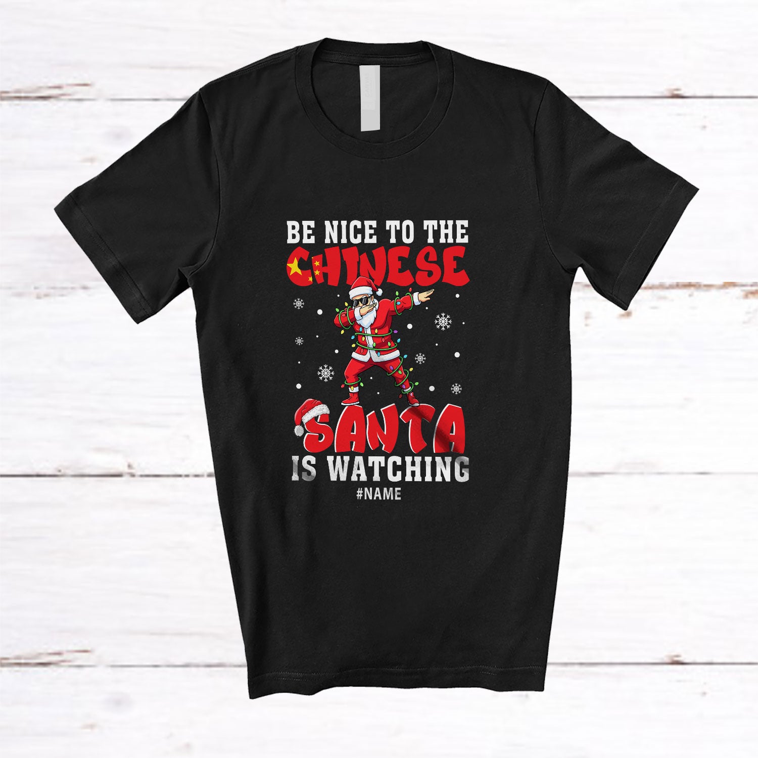 • Personalized Custom Name Nice To The Chinese; Amusing Christmas Lights Dabbing Santa T-Shirt. This cotton t-shirt is a durable staple product with a classic fit. One of the most popular items, it has a relaxed style made for everyday and casual wear.
