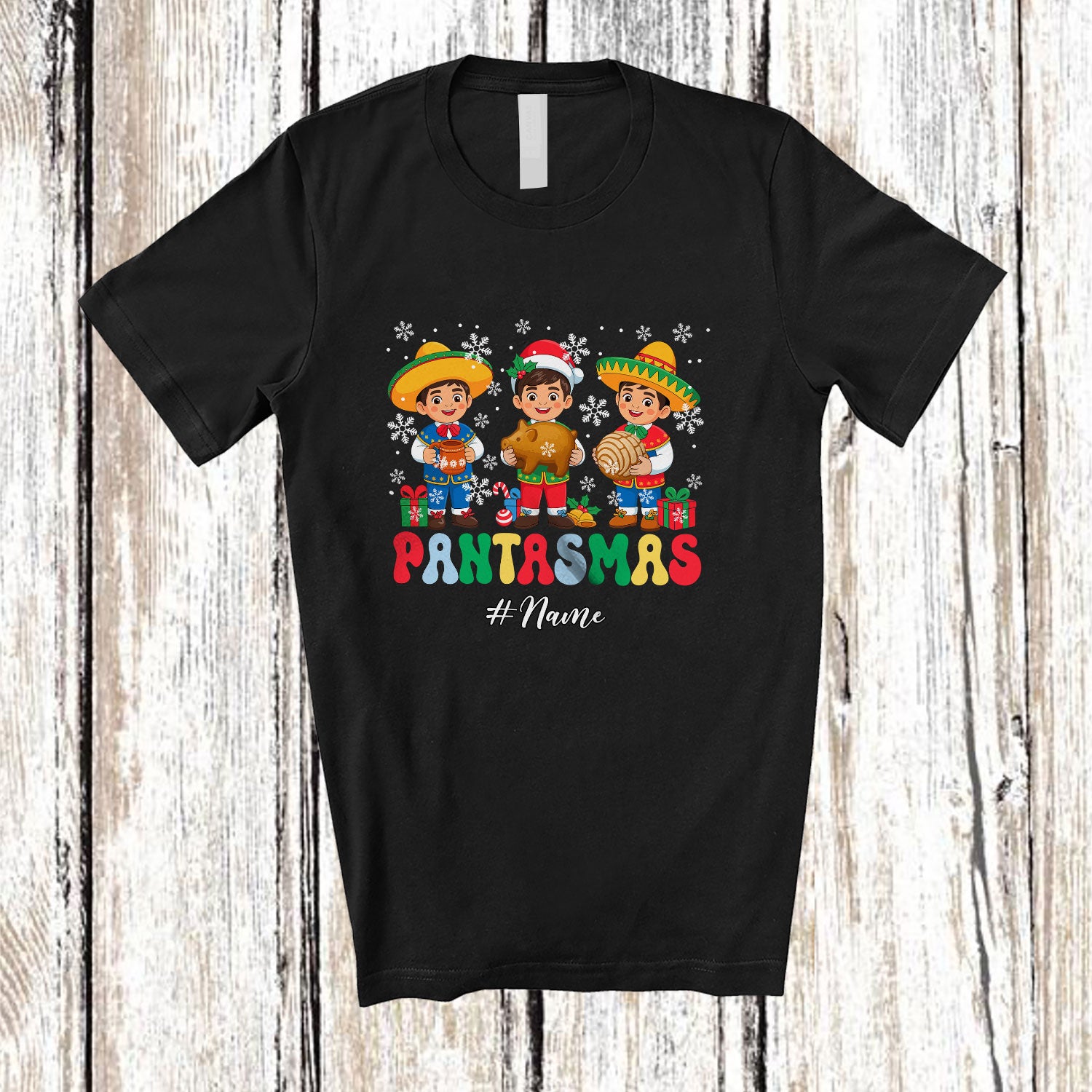 Personalized Custom Name Pantasmas; Adorable Christmas Three Mexican Boy Pan Dulce; Family T-Shirt. This cotton t-shirt is a durable staple product with a classic fit. One of the most popular items, it has a relaxed style made for everyday and casual wear.