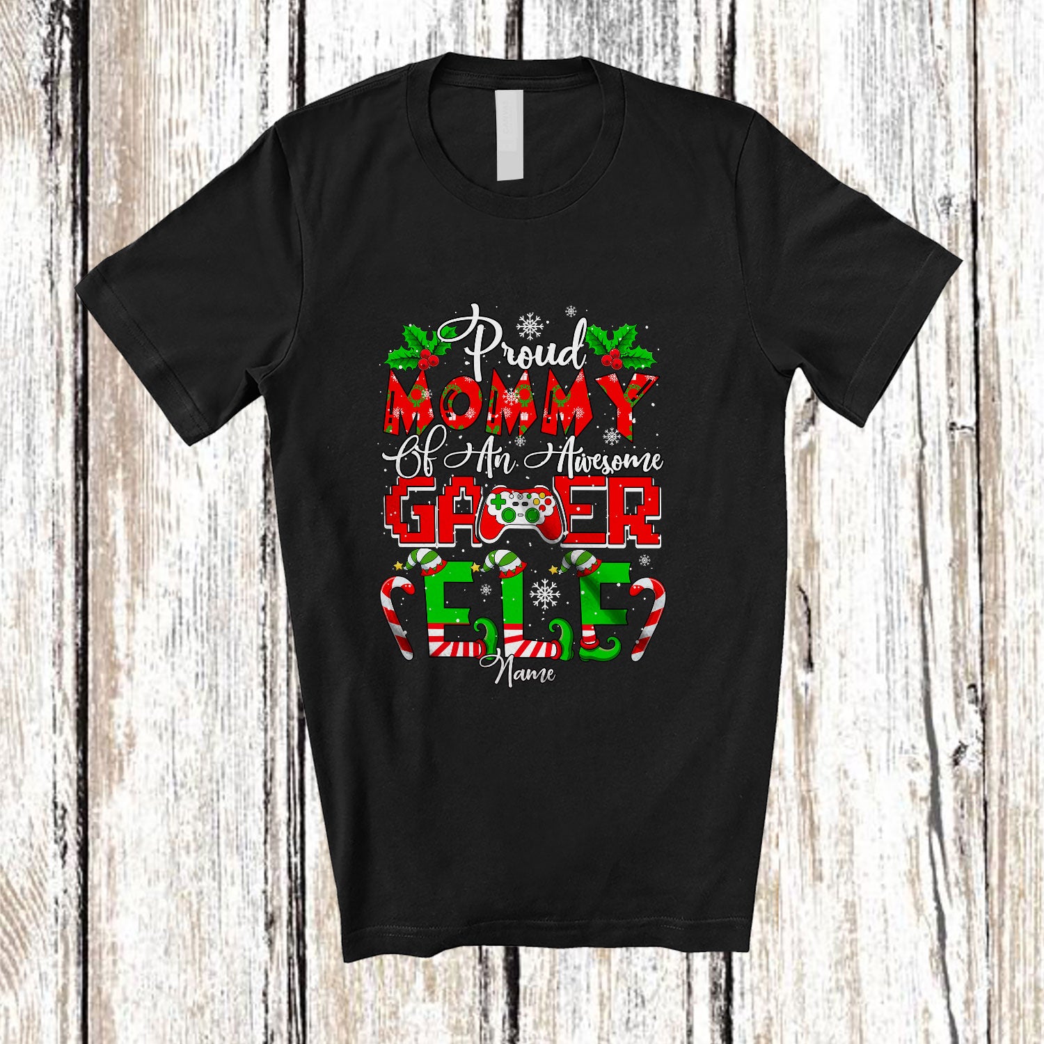 Personalized Custom Name Proud Mommy Of Gamer Elf; Joyful Christmas Mother's Day Family T-Shirt. This cotton t-shirt is a durable staple product with a classic fit. One of the most popular items, it has a relaxed style made for everyday and casual wear.