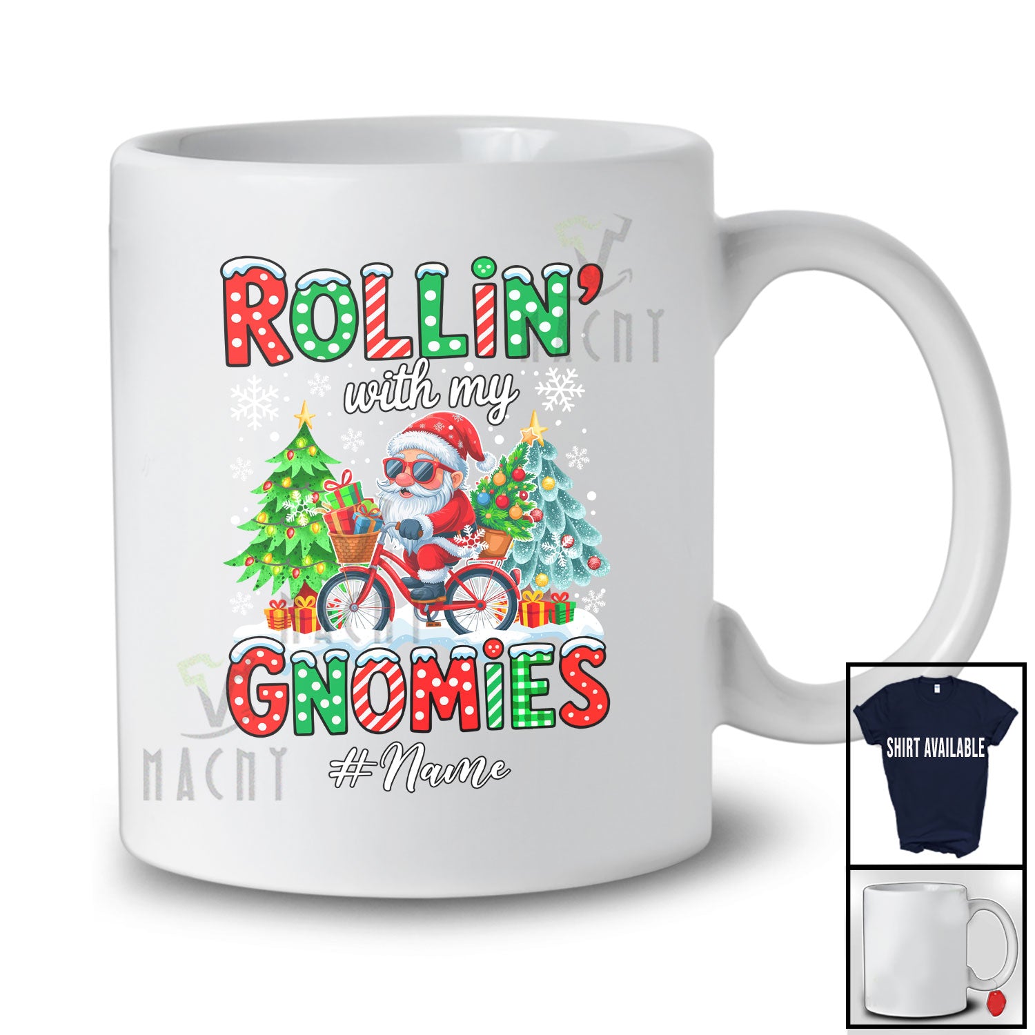 • Personalized Custom Name Rollin' With My Gnomies; Joyful Christmas Santa Gnome Riding Bicycle T-Shirt. This cotton t-shirt is a durable staple product with a classic fit. One of the most popular items, it has a relaxed style made for everyday and casual wear.