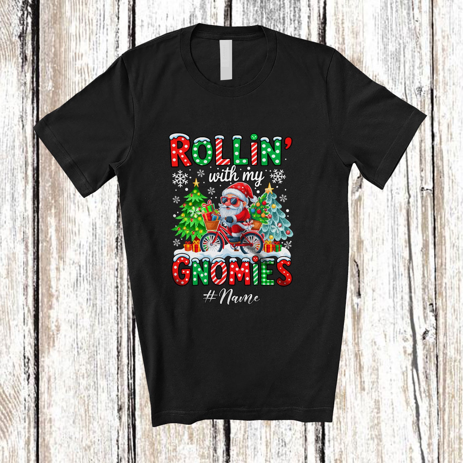 Personalized Custom Name Rollin' With My Gnomies; Joyful Christmas Santa Gnome Riding Bicycle T-Shirt