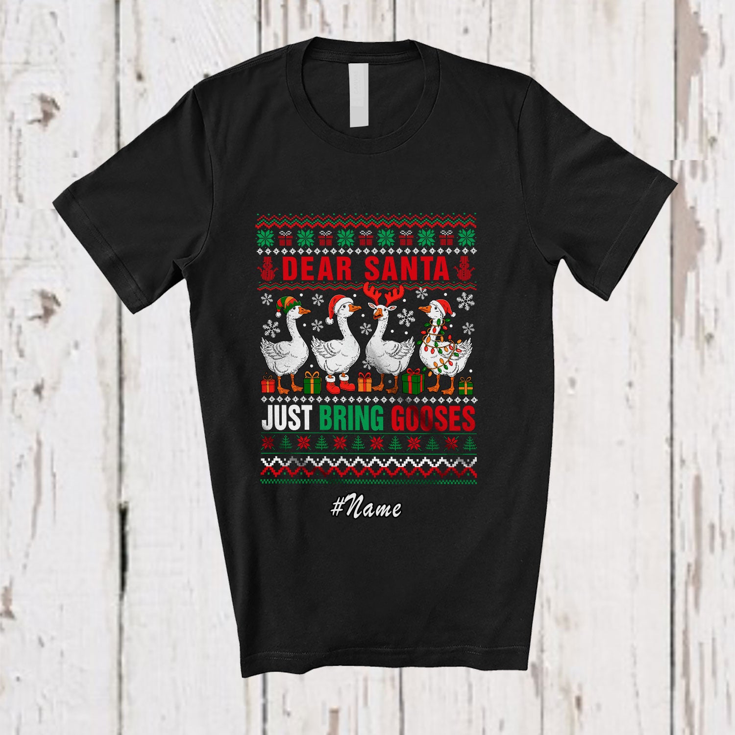 Personalized Custom Name Santa Bring Gooses; Fantastic Christmas Sweater Goose Farmer Farm T-Shirt. This cotton t-shirt is a durable staple product with a classic fit. One of the most popular items, it has a relaxed style made for everyday and casual wear.