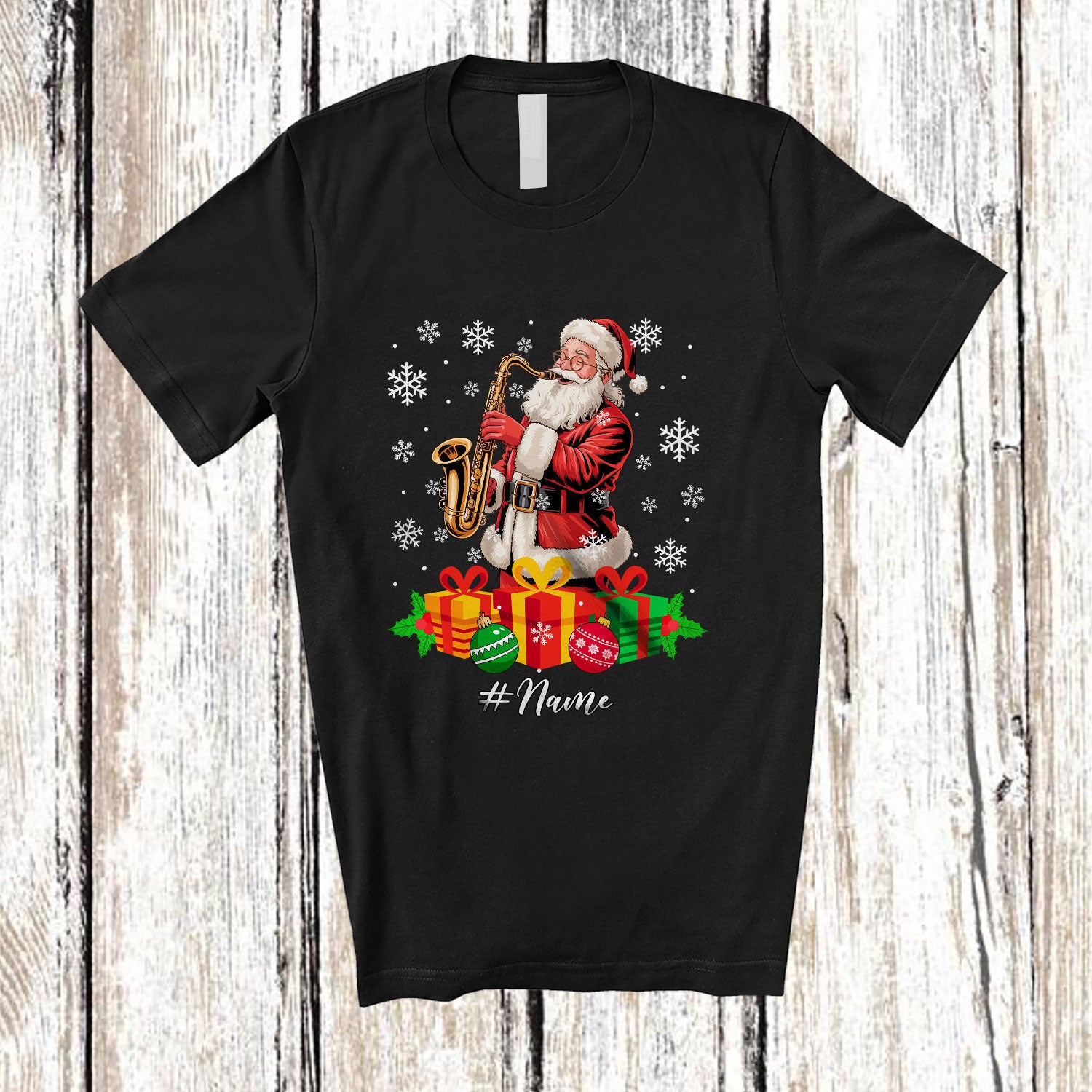 • Personalized Custom Name Santa Playing Saxophone; Amusing Christmas Musical Instruments Player T-Shirt. This cotton t-shirt is a durable staple product with a classic fit. One of the most popular items, it has a relaxed style made for everyday and casual wear.