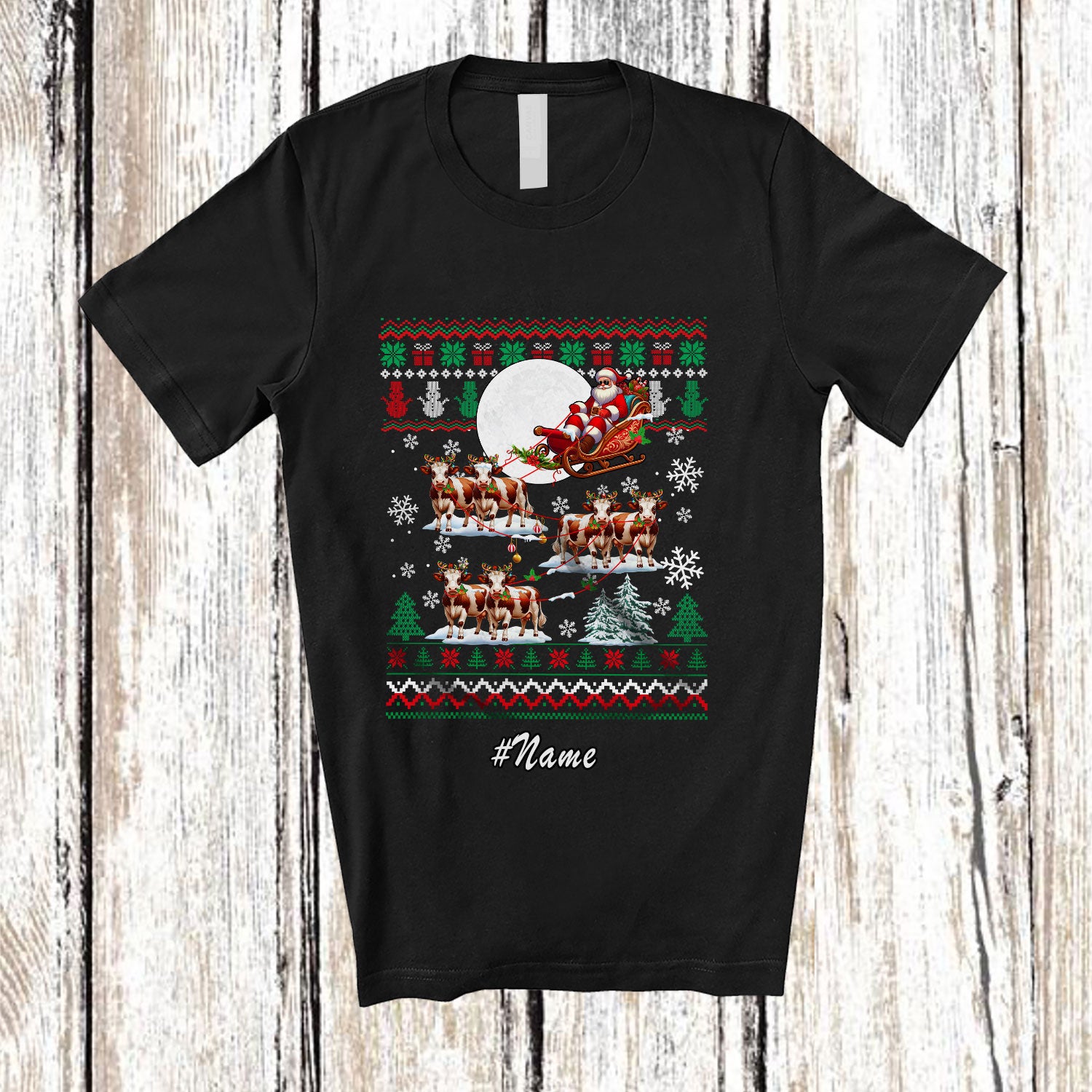 The Personalized Custom Name Santa Sleigh Reindeer Cows; Humorous Christmas Sweater Farmer T-Shirt is evocative, to say the least, but that's why you're drawn to it in the first place.