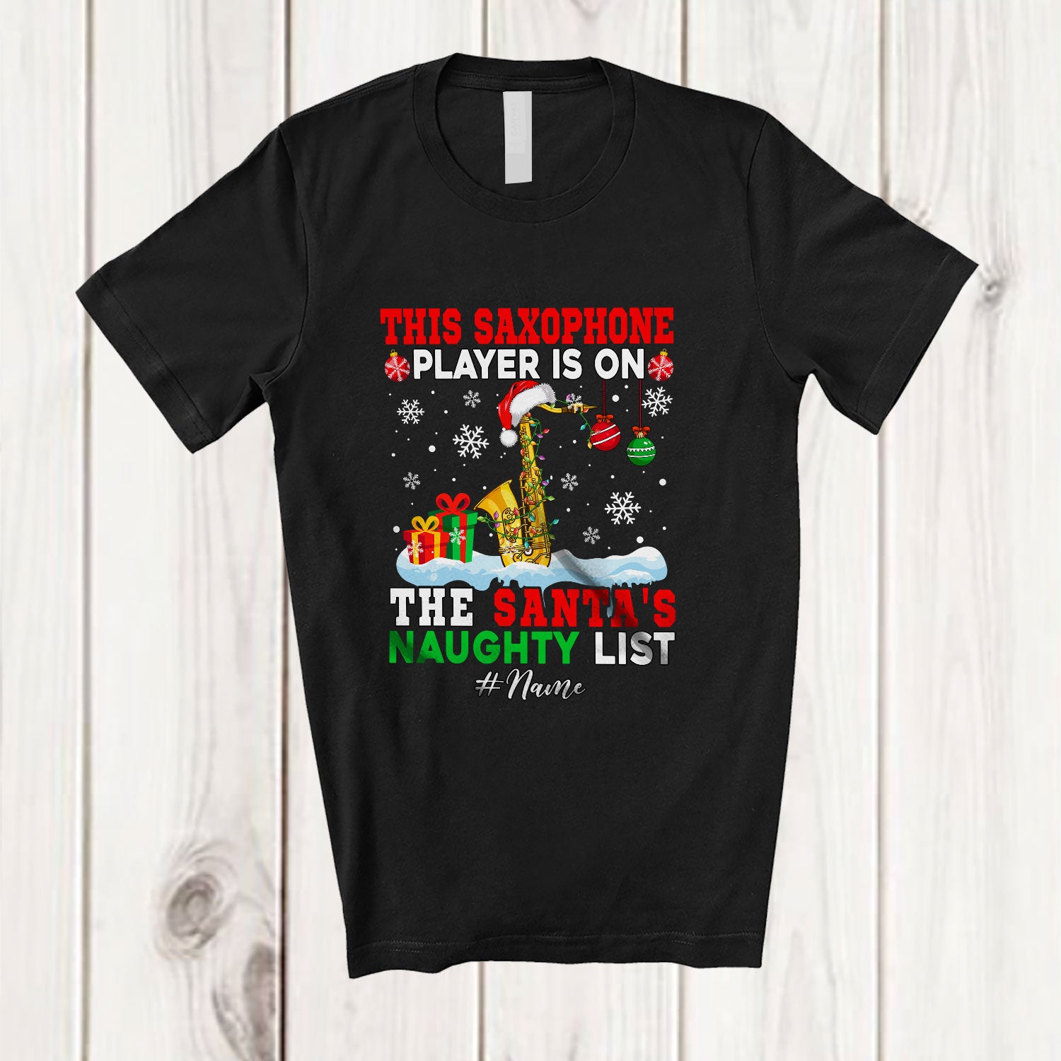 • Personalized Custom Name Saxophone Player Team On Naughty List; Joyful Christmas Musician Snowman T-Shirt. This cotton t-shirt is a durable staple product with a classic fit. One of the most popular items, it has a relaxed style made for everyday and casual wear.