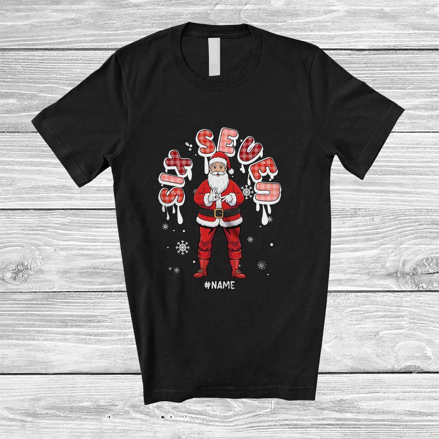 Personalized Custom Name Six Seven; Amusing Christmas Plaid Santa; X-mas Family Group T-Shirt. This cotton t-shirt is a durable staple product with a classic fit. One of the most popular items, it has a relaxed style made for everyday and casual wear.