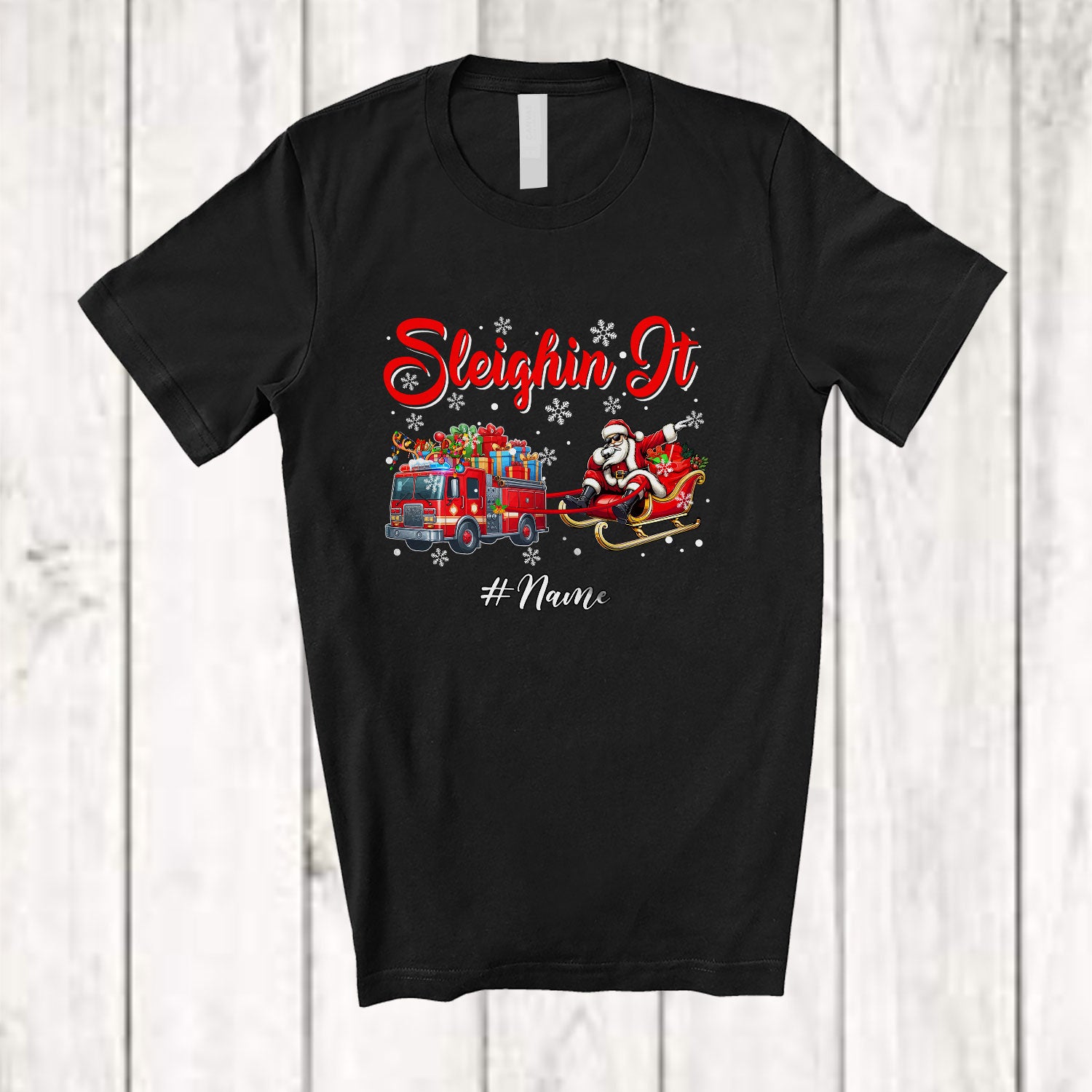 • Personalized Custom Name Sleighin It; Joyful Christmas Santa Dabbing Sleigh Fire Truck Reindeer T-Shirt. This cotton t-shirt is a durable staple product with a classic fit. One of the most popular items, it has a relaxed style made for everyday and casual wear.