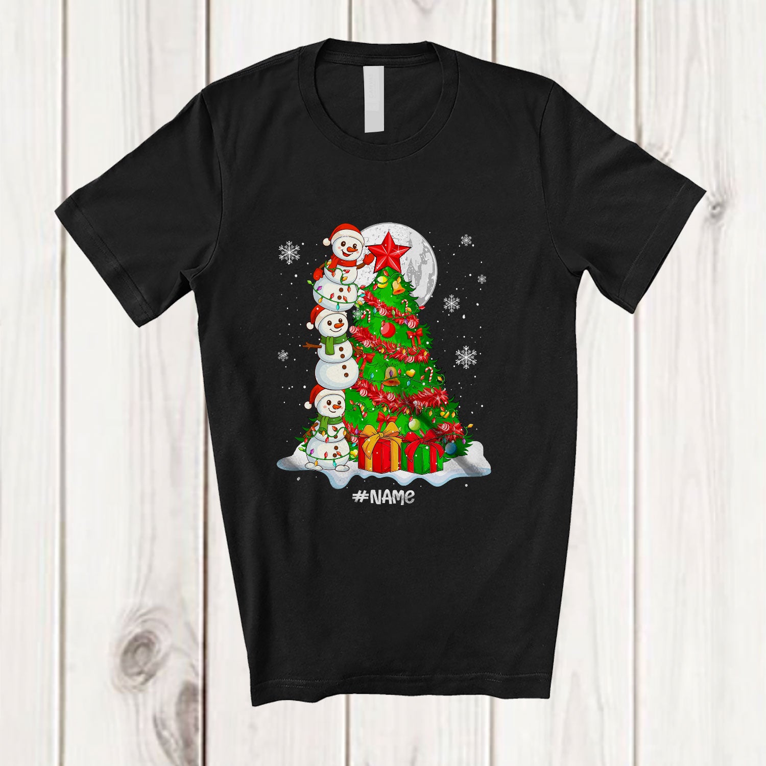• Personalized Custom Name Snowman Building Christmas Tree; Merry X-mas Snowman; Family T-Shirt. This cotton t-shirt is a durable staple product with a classic fit. One of the most popular items, it has a relaxed style made for everyday and casual wear.