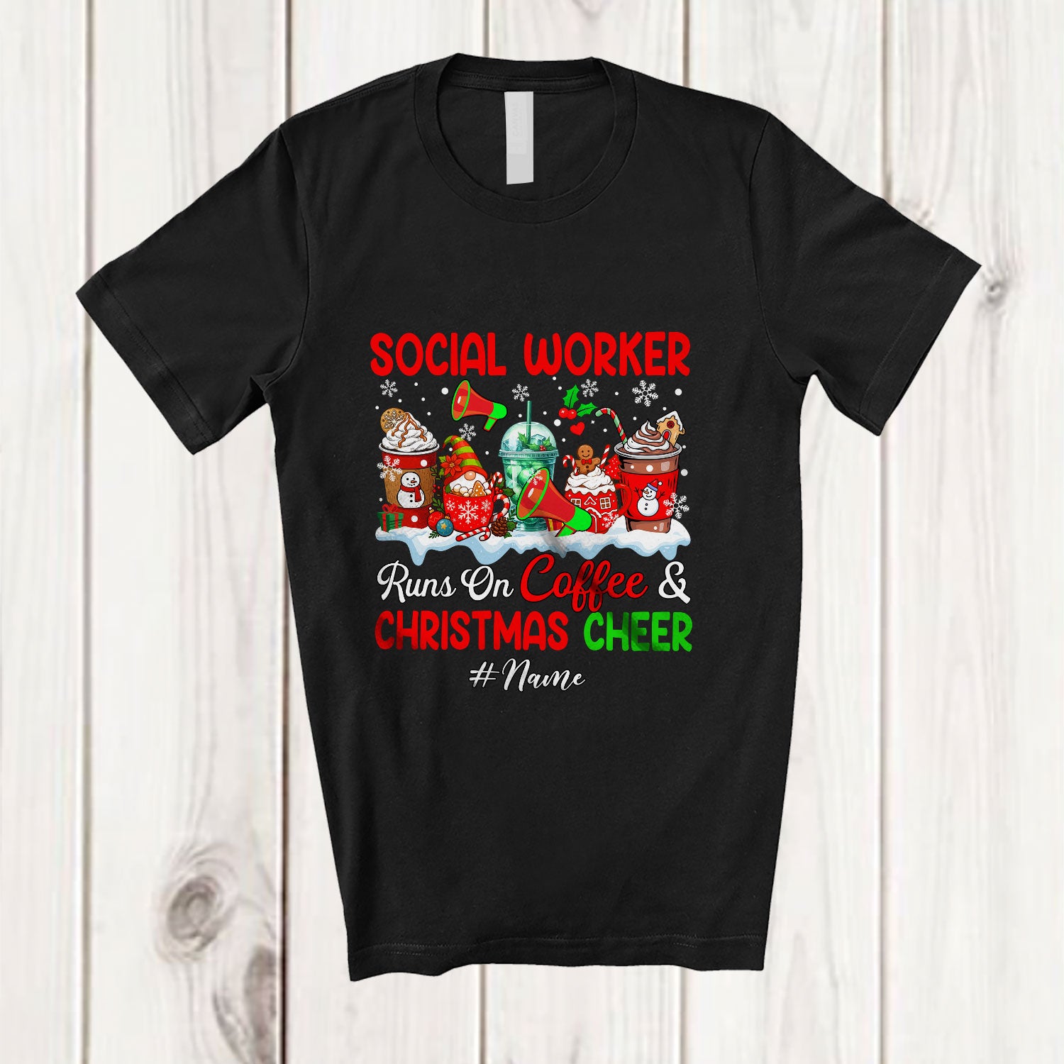 Personalized Custom Name Social Worker Runs On Coffee Christmas Cheer; Lovely Snow Jobs T-Shirt. This cotton t-shirt is a durable staple product with a classic fit. One of the most popular items, it has a relaxed style made for everyday and casual wear.