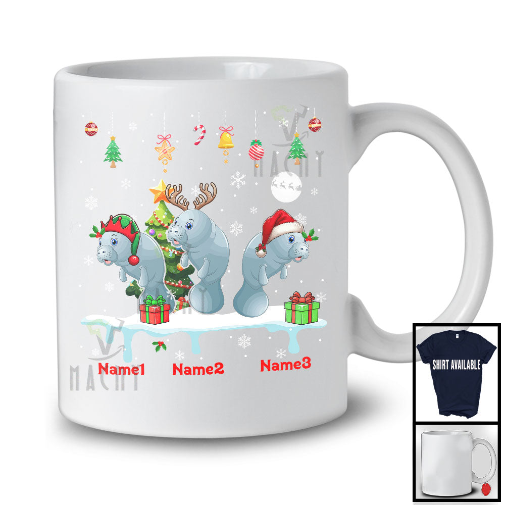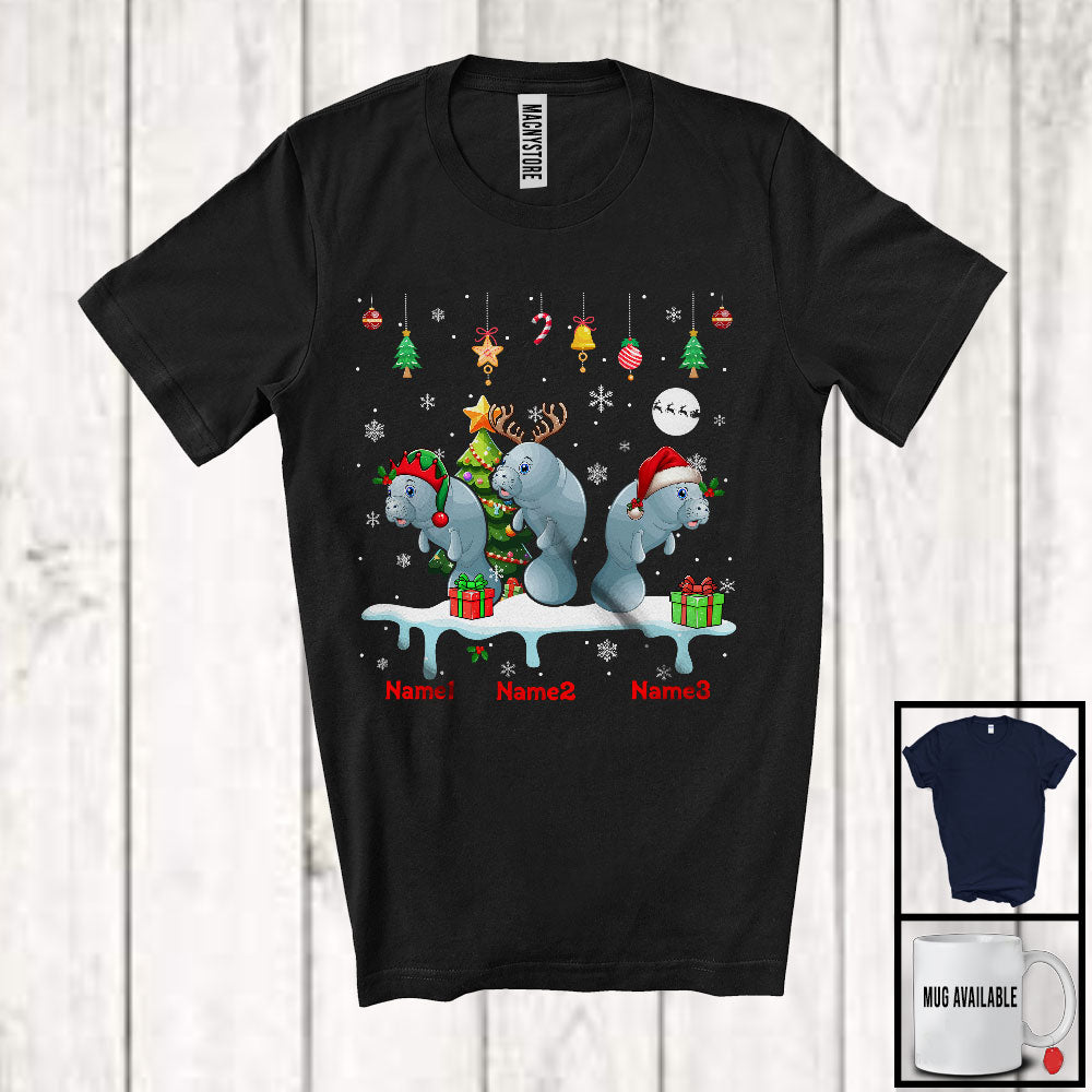 Personalized Custom Name Three Elf Santa Manatee Snowing; Joyful Christmas Tree Animal T-Shirt
