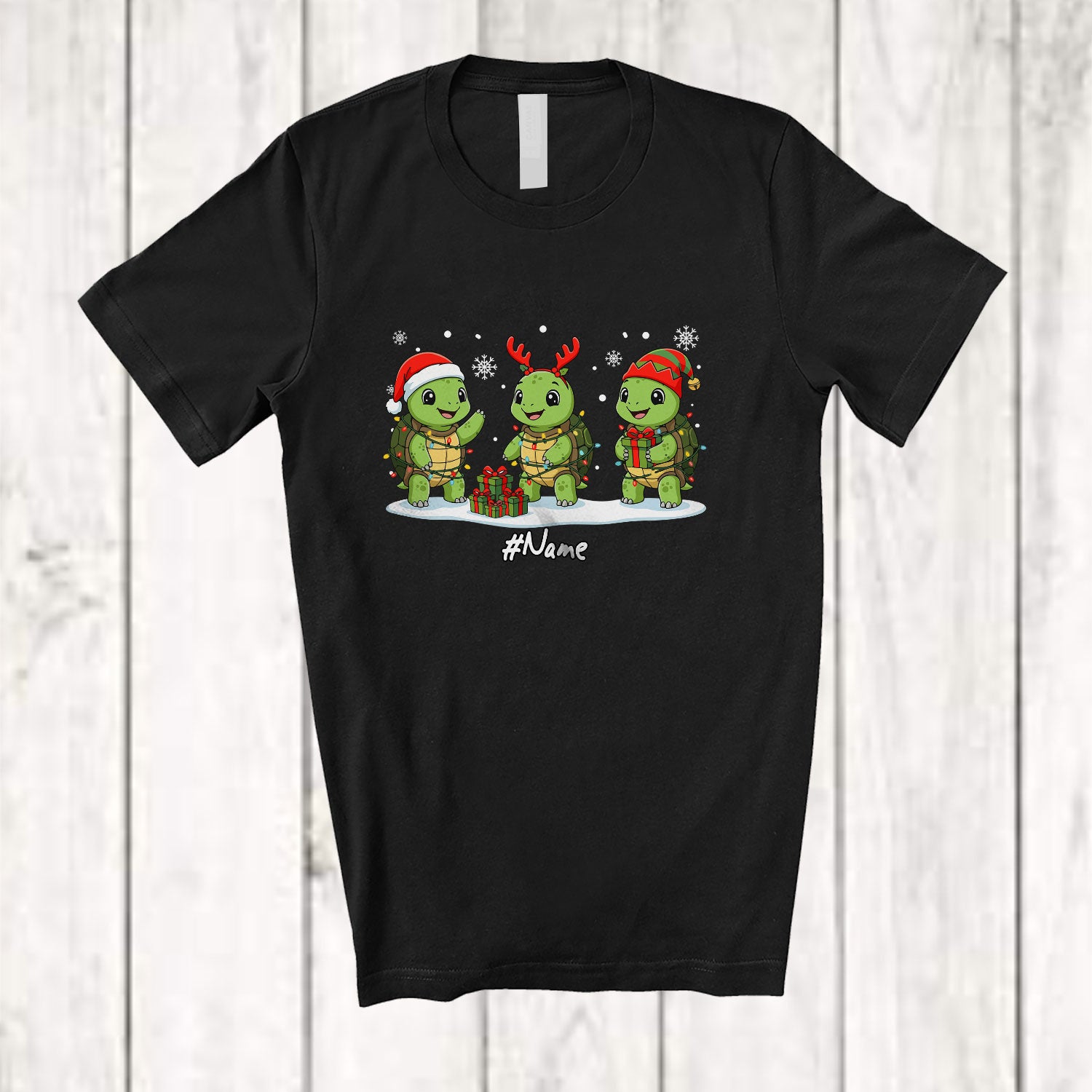 Personalized Custom Name Three Santa Elf Turtle Snowing; Lovely Christmas Lights Sea Animal T-Shirt