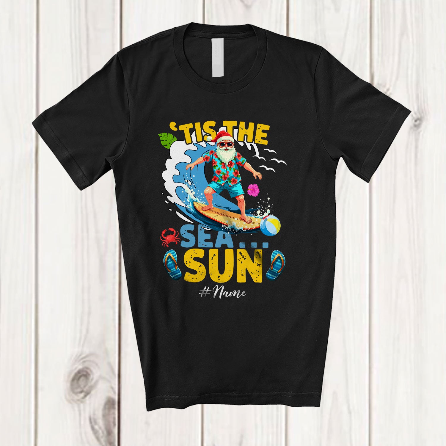 Personalized Custom Name Tis The Sea Sun; Cheerful Christmas In July Summer Santa Surfing T-Shirt