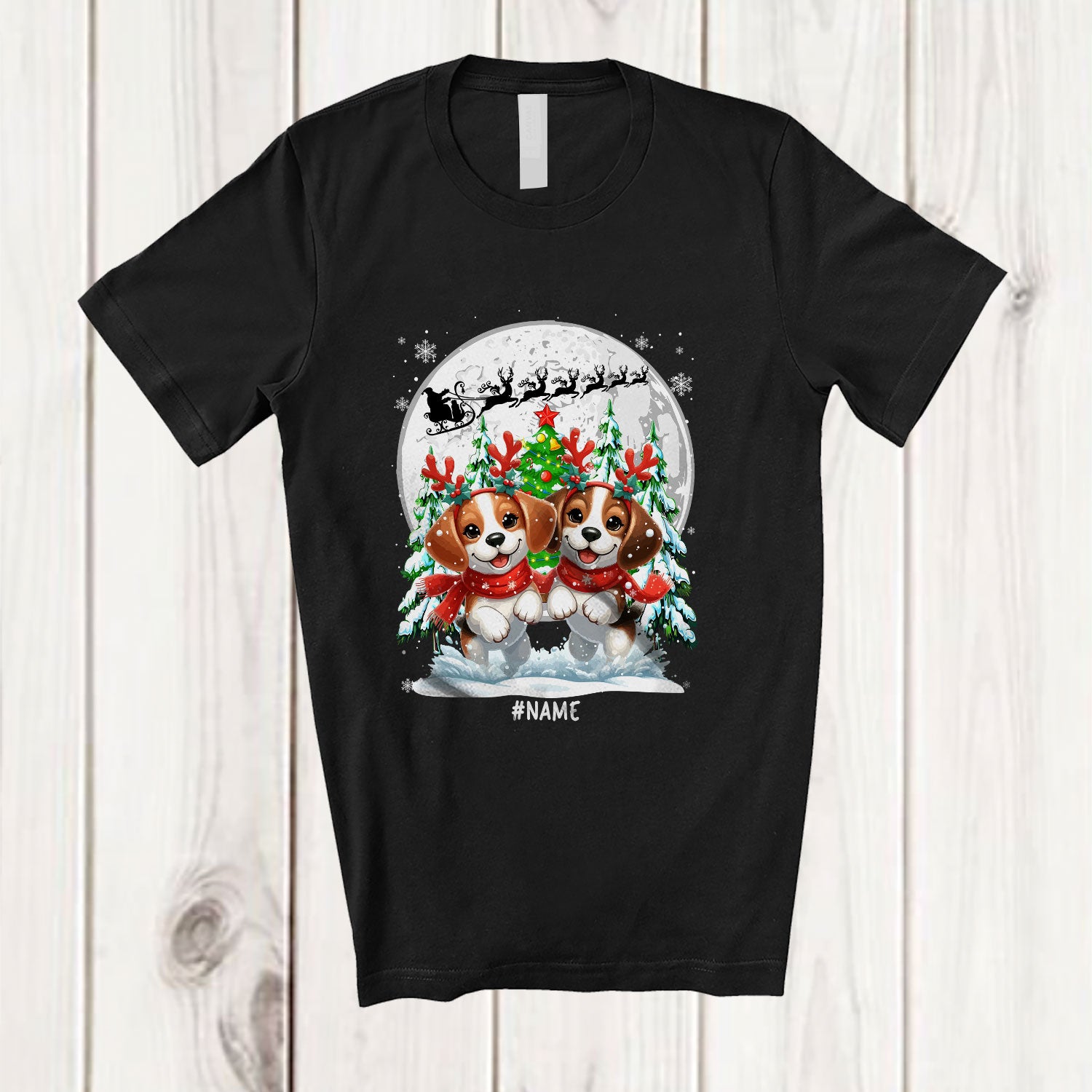 Personalized Custom Name Two Beagles Reindeer Running; Lovely Christmas Moon Tree Family T-Shirt. This cotton t-shirt is a durable staple product with a classic fit. One of the most popular items, it has a relaxed style made for everyday and casual wear.