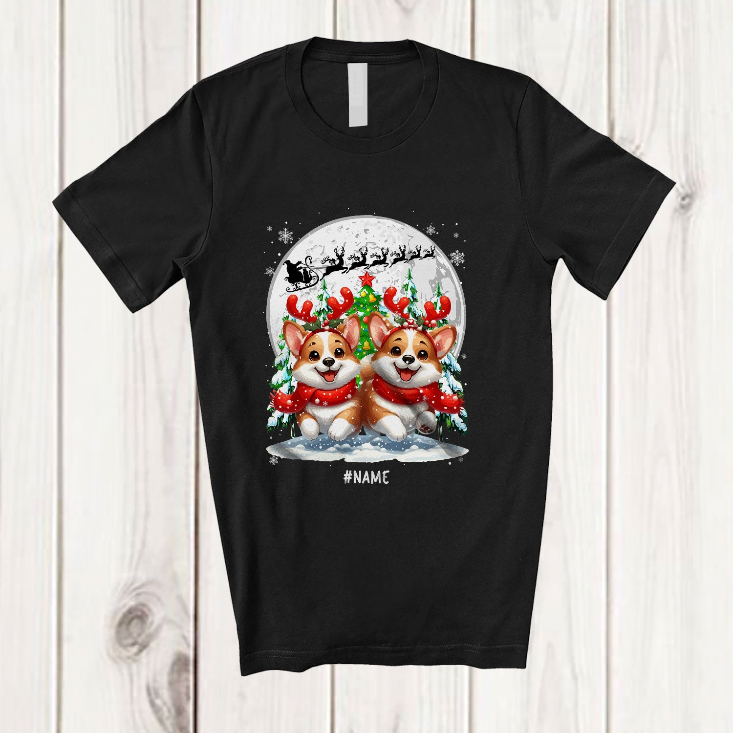 • Personalized Custom Name Two Corgis Reindeer Running; Lovely Christmas Moon Tree Family T-Shirt. This cotton t-shirt is a durable staple product with a classic fit. One of the most popular items, it has a relaxed style made for everyday and casual wear.