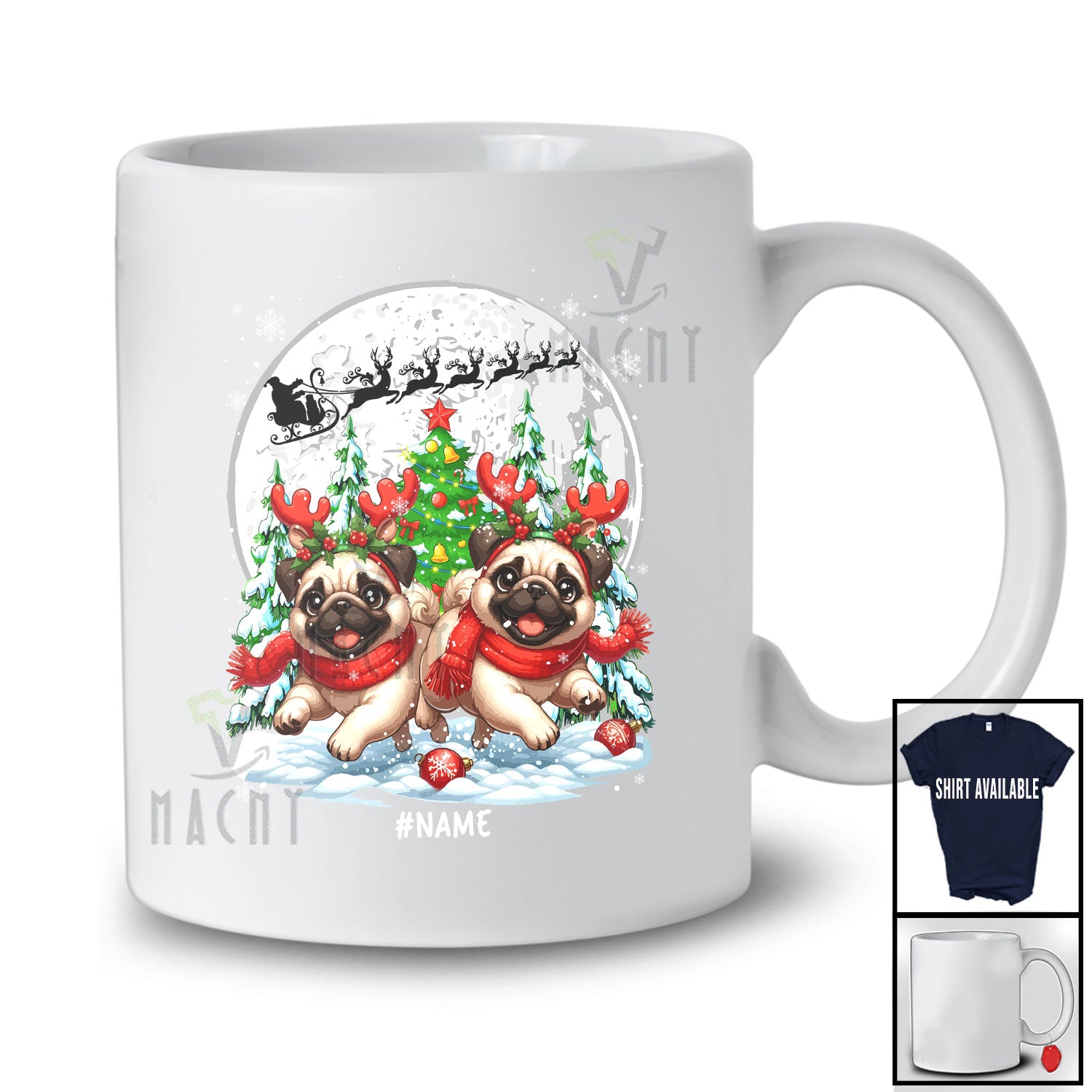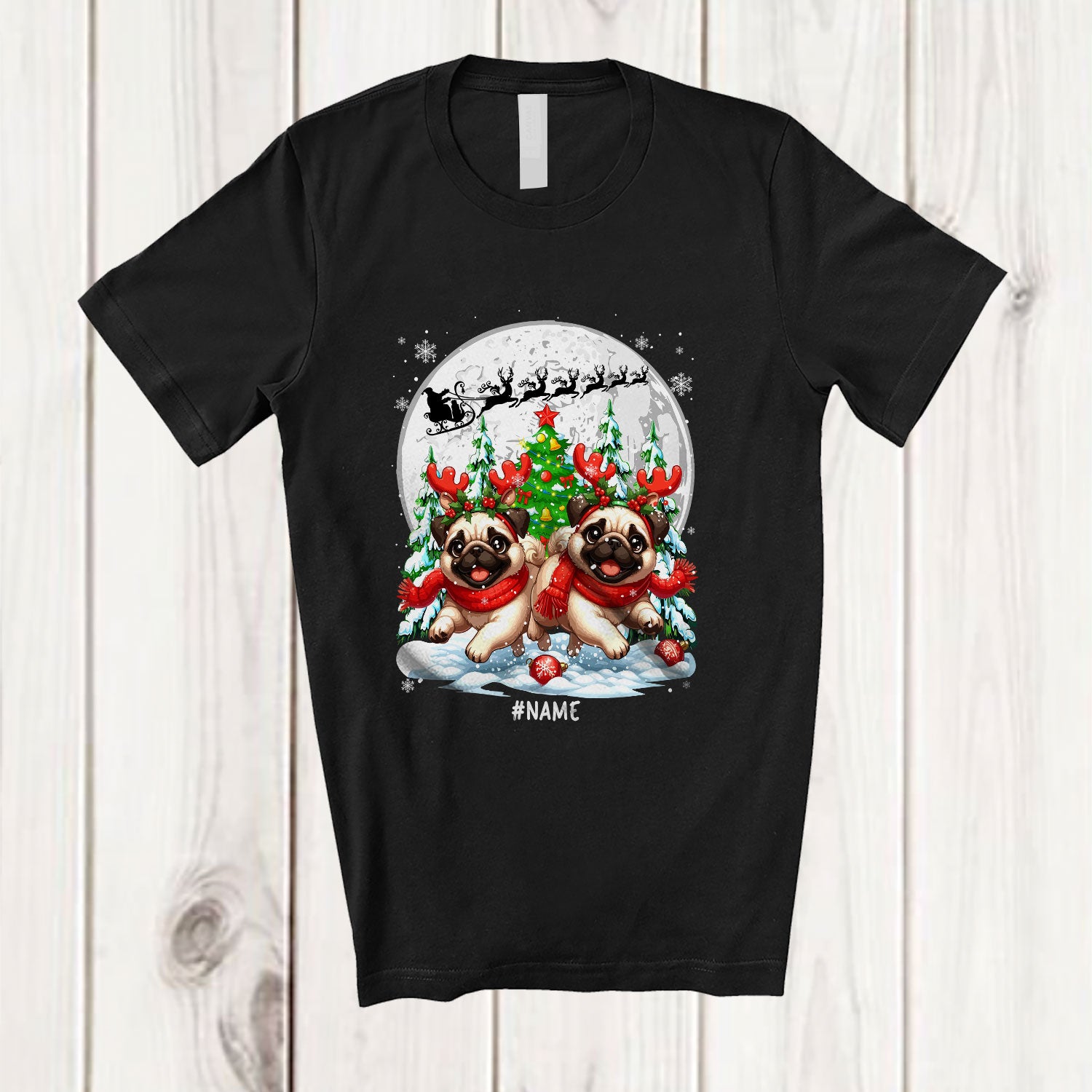 Personalized Custom Name Two Pugs Reindeer Running; Lovely Christmas Moon Tree Family T-Shirt