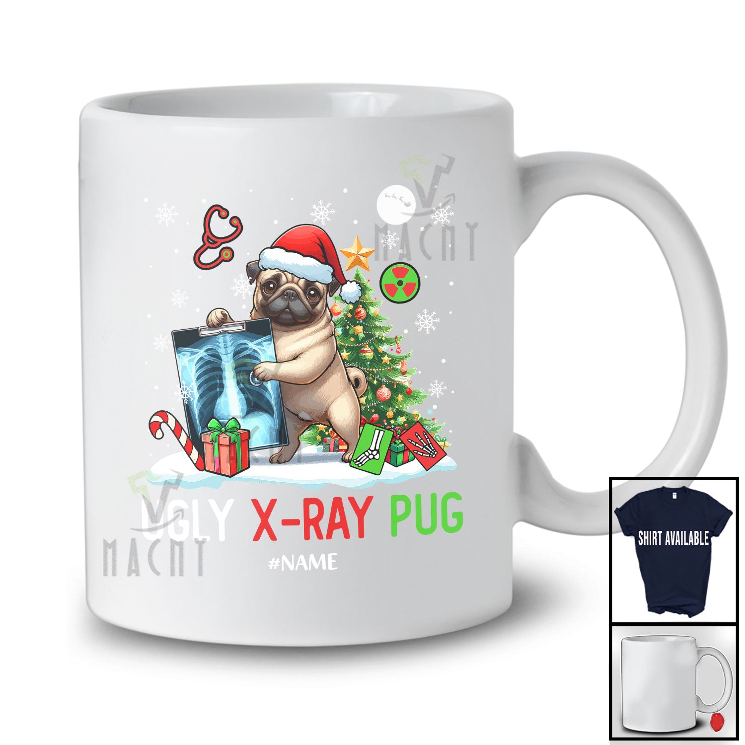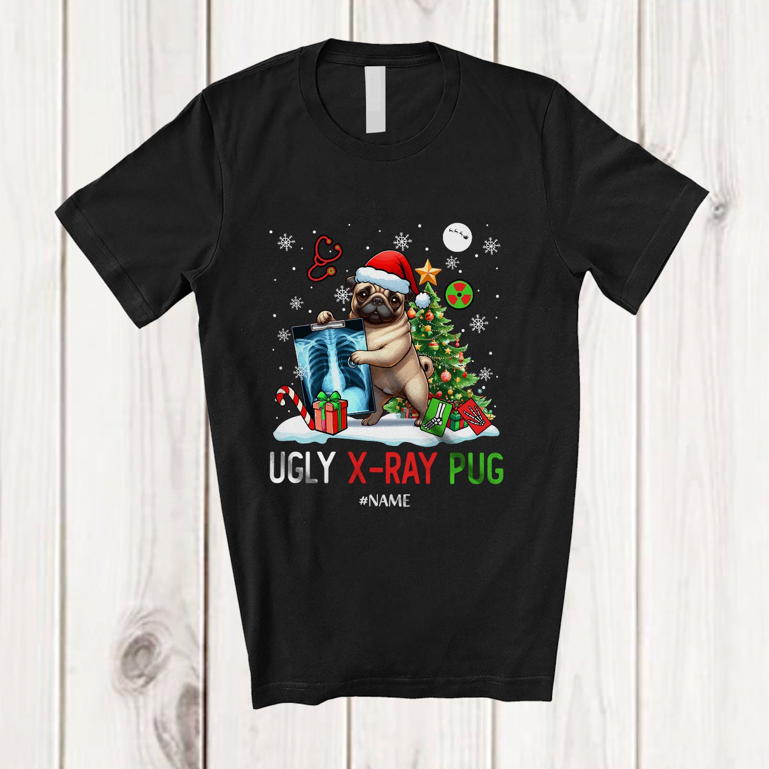 • Personalized Custom Name Ugly X-Ray Pug; Humorous Christmas Tree Santa Pug Owner T-Shirt. This cotton t-shirt is a durable staple product with a classic fit. One of the most popular items, it has a relaxed style made for everyday and casual wear.