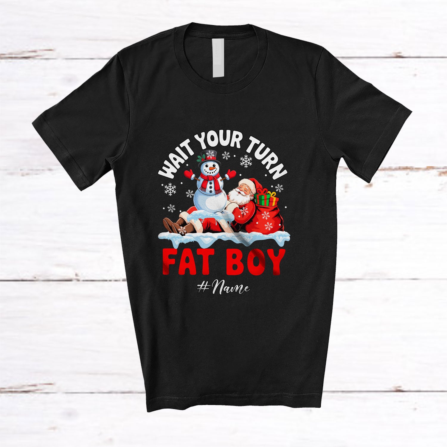 Personalized Custom Name Wait Your Turn Fat Boy; Humorous Christmas Snowman Santa Fighting T-Shirt. This cotton t-shirt is a durable staple product with a classic fit. One of the most popular items, it has a relaxed style made for everyday and casual wear.