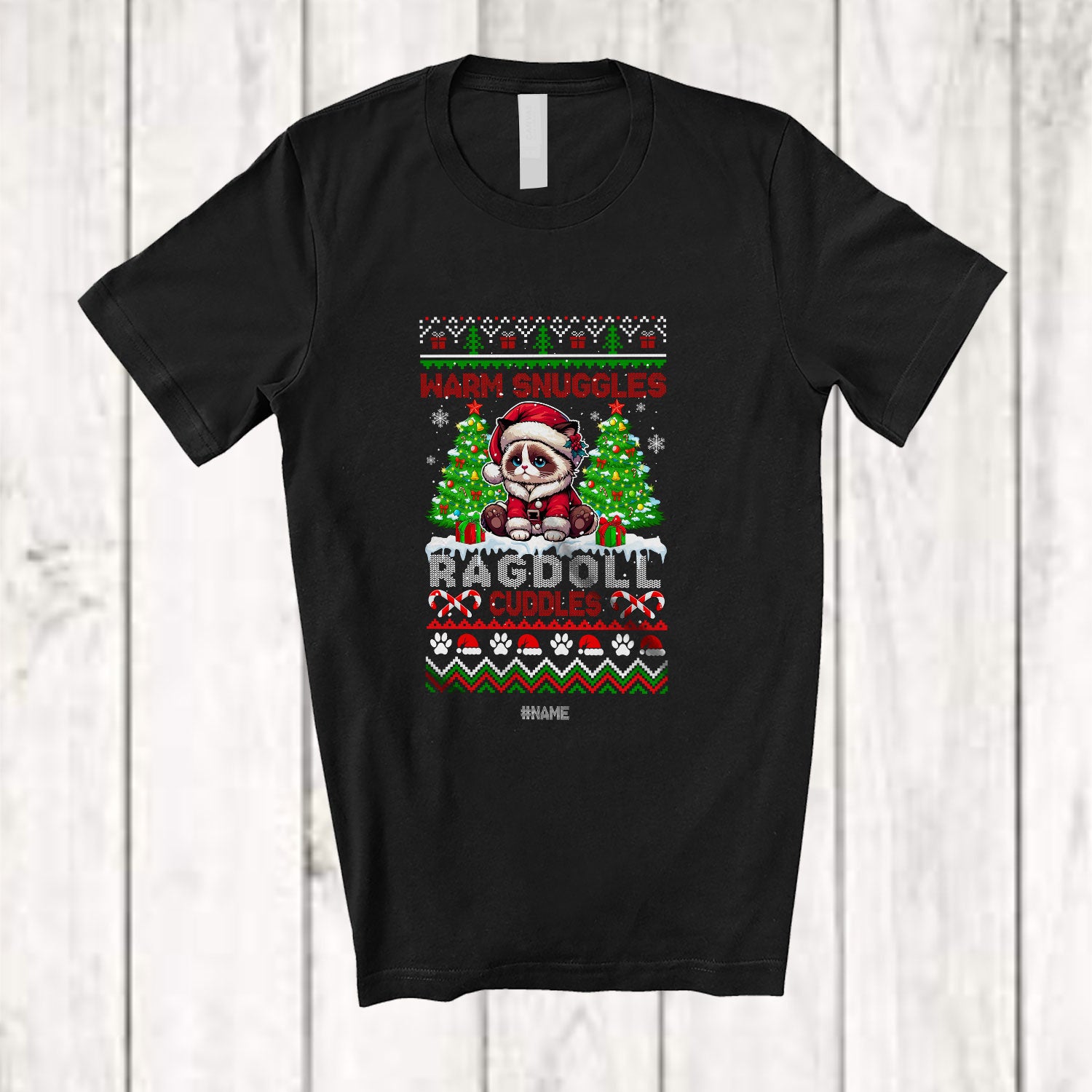 • Personalized Custom Name Warm Snuggles Ragdoll Cuddles; Lovely Christmas Tree Sweater T-Shirt. This cotton t-shirt is a durable staple product with a classic fit. One of the most popular items, it has a relaxed style made for everyday and casual wear.