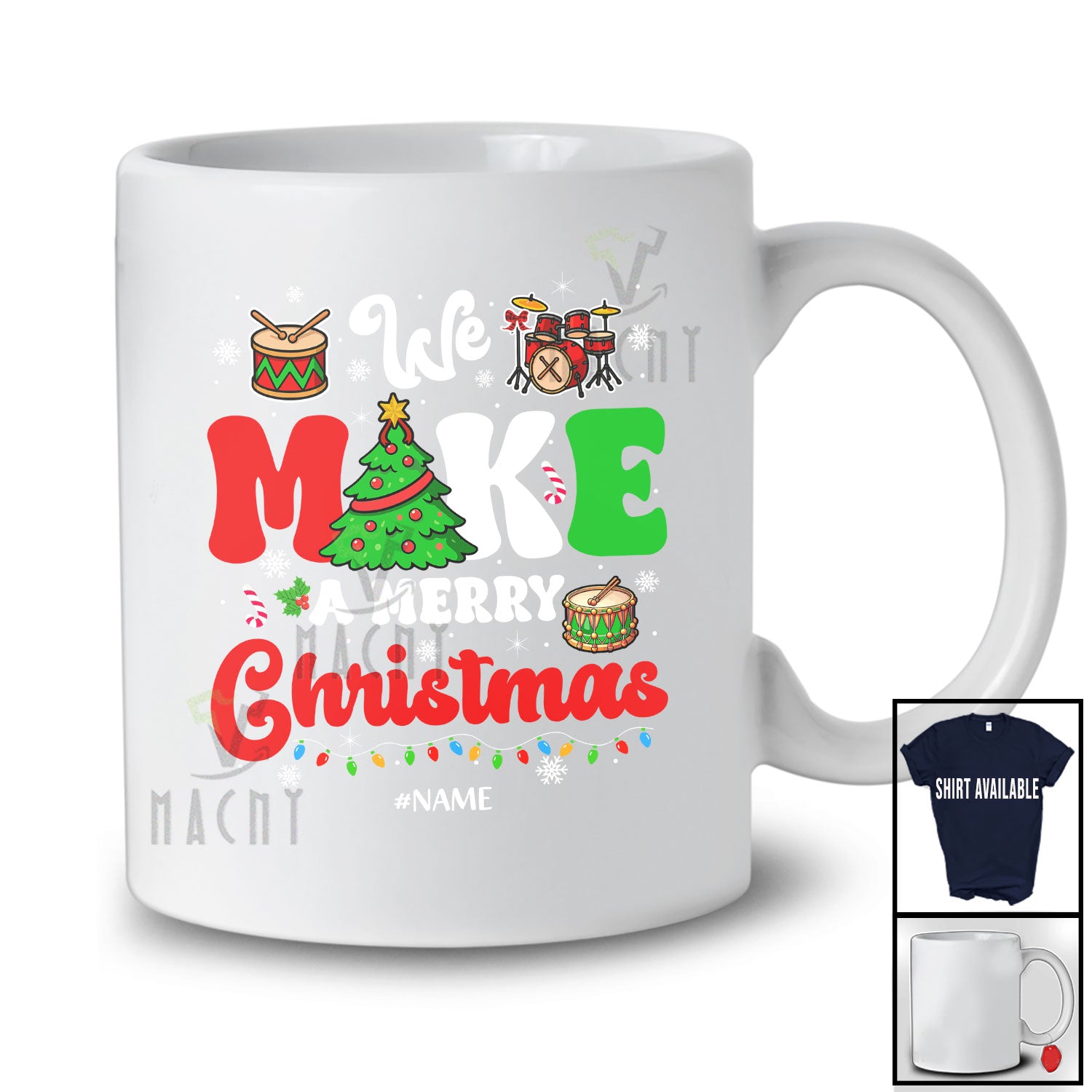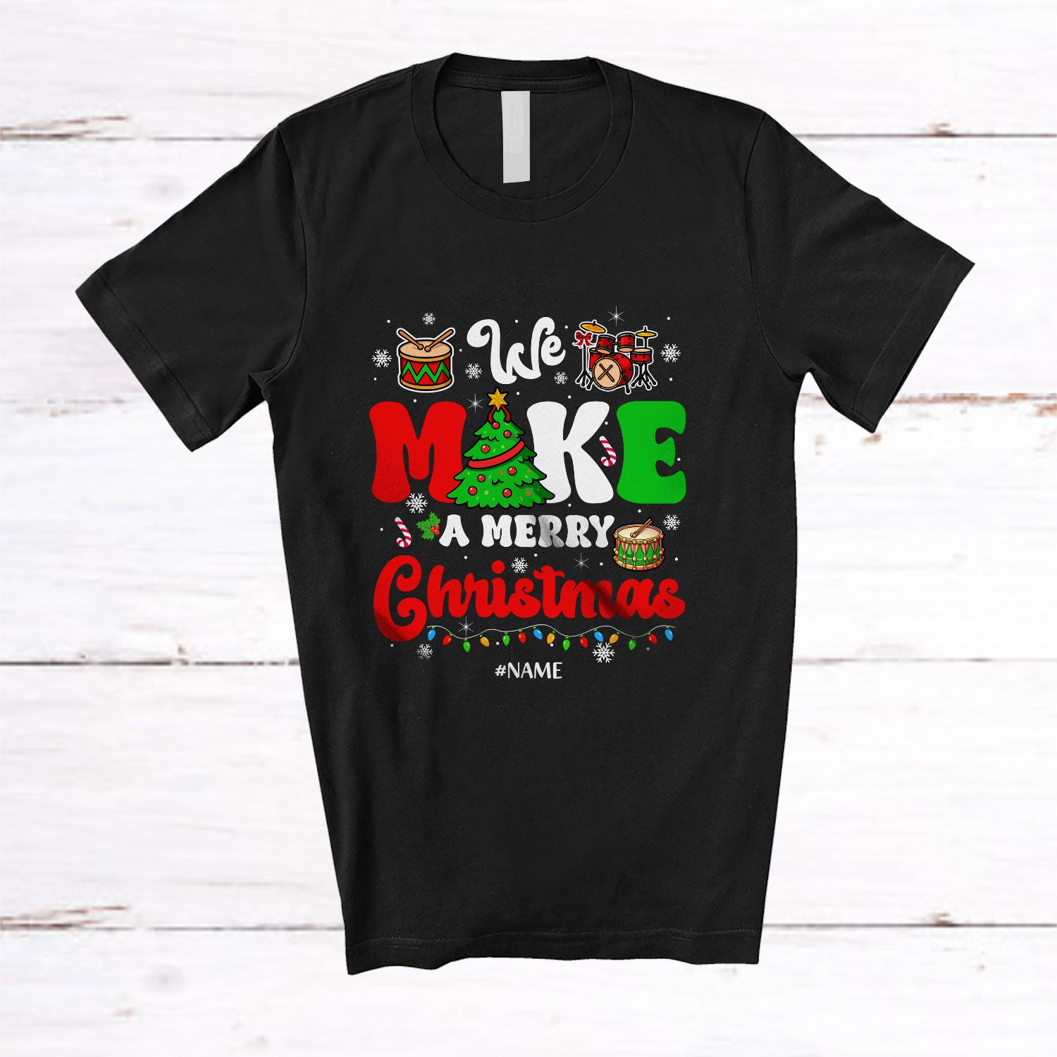 Personalized Custom Name We Make A Merry Christmas; Awesome X-mas Lights Tree Drummer Teacher T-Shirt. This cotton t-shirt is a durable staple product with a classic fit. One of the most popular items, it has a relaxed style made for everyday and casual wear.