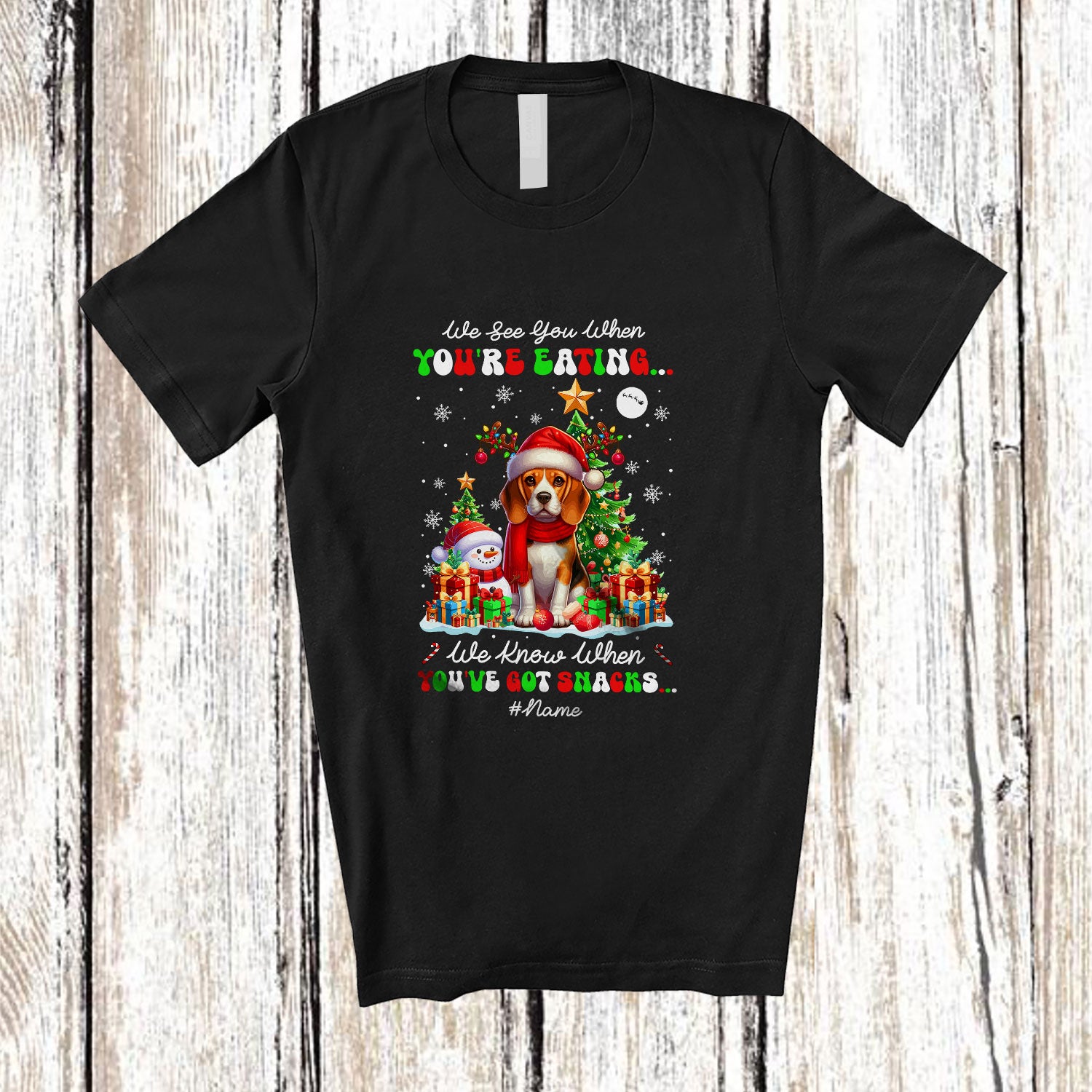 • Personalized Custom Name We See You Eating; Amusing Christmas Tree Beagle Owner T-Shirt. This cotton t-shirt is a durable staple product with a classic fit. One of the most popular items, it has a relaxed style made for everyday and casual wear.