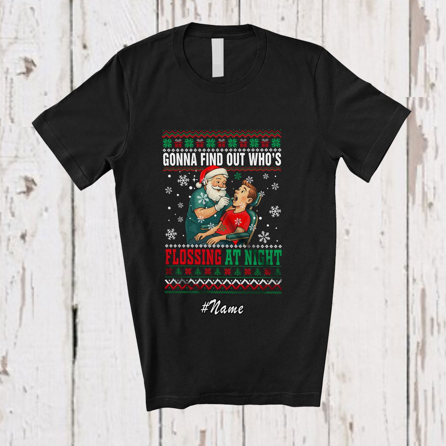 • Personalized Custom Name Who's Flossing; Joyful Christmas Sweater Santa Dental Dentist Hygienist T-Shirt. This cotton t-shirt is a durable staple product with a classic fit. One of the most popular items, it has a relaxed style made for everyday and casual wear.