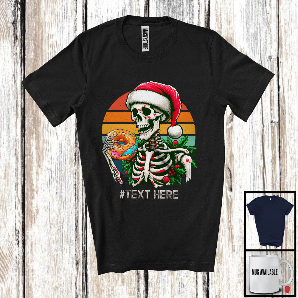 Personalized Custom Text Vintage Retro Santa Skeleton Donut; Merry Christmas Food Eating Team T-Shirt. This cotton t-shirt is a durable staple product with a classic fit. One of the most popular items, it has a relaxed style made for everyday and casual wear.