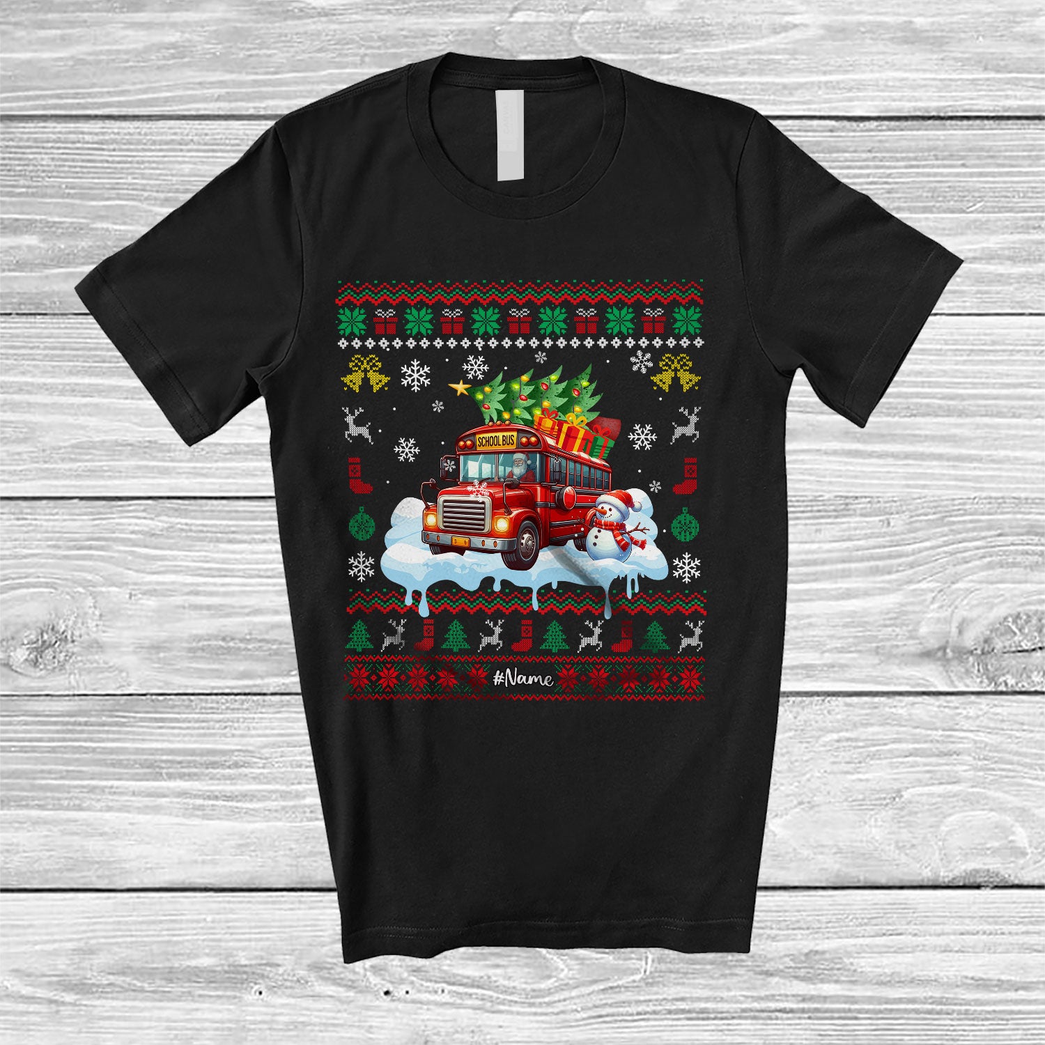 Personalized Santa Christmas Tree On School Bus; Joyful Sweater Snowman; Custom Name Driver T-Shirt