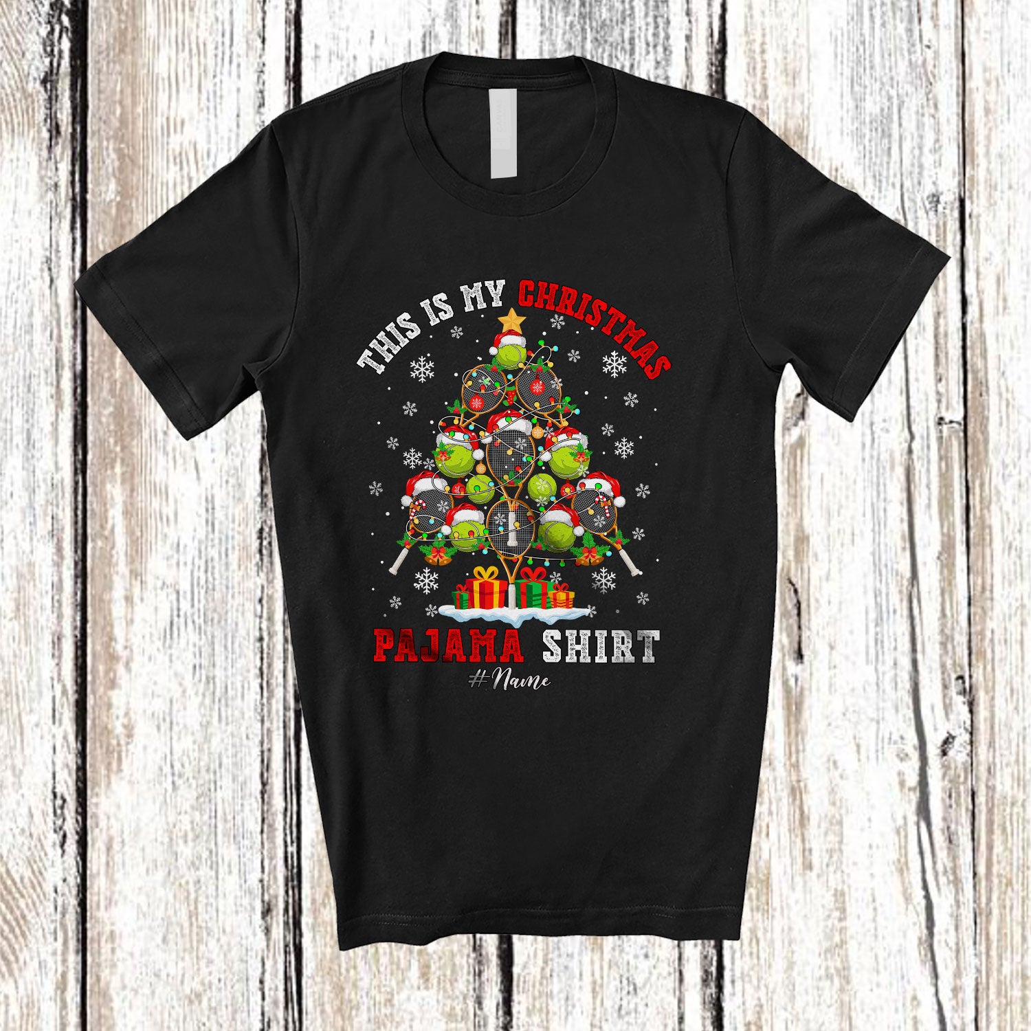 Personalized This Is My Christmas Pajama Shirt; Joyful X-mas Tree Tennis; Custom Name Tennis Player T-Shirt. This cotton t-shirt is a durable staple product with a classic fit. One of the most popular items, it has a relaxed style made for everyday and casual wear.