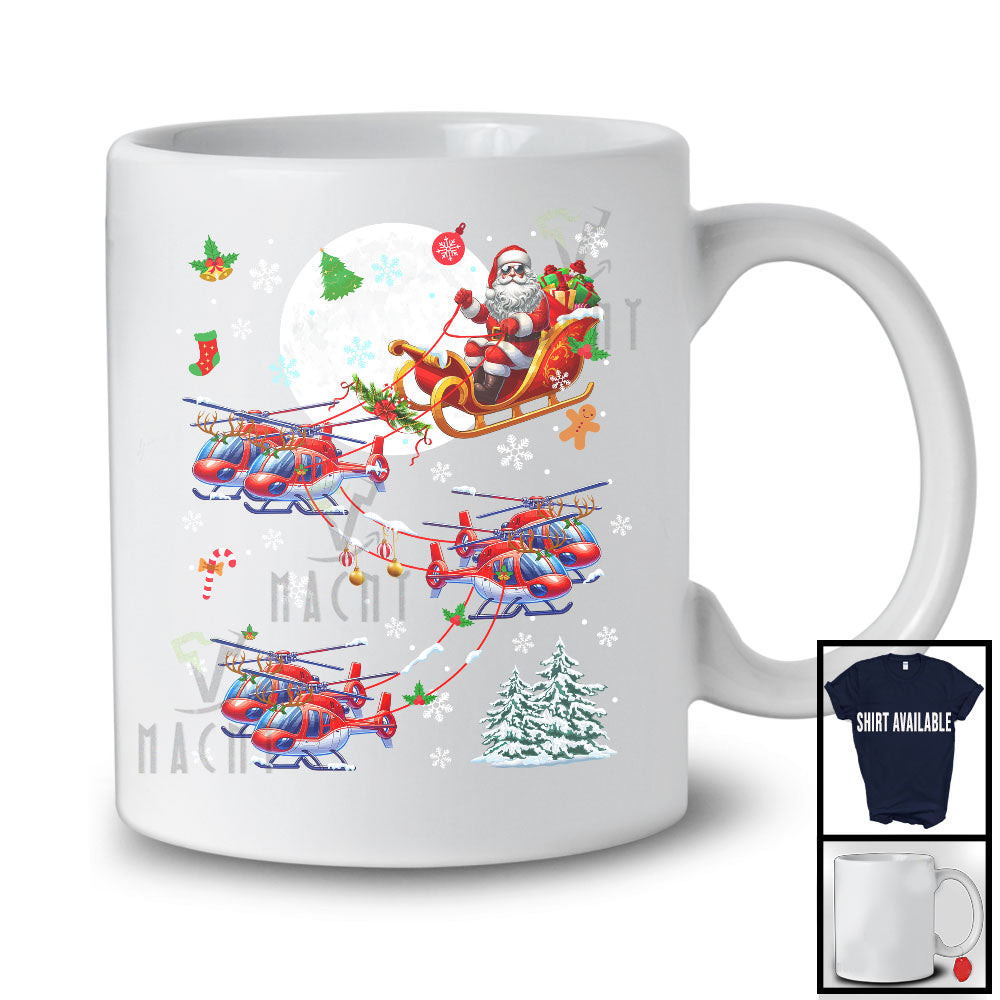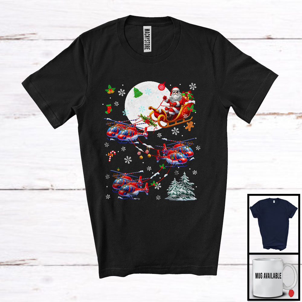Santa Riding Helicopter Reindeer Sleigh; Humorous Christmas Moon Helicopter; X-mas Tree Snow T-Shirt