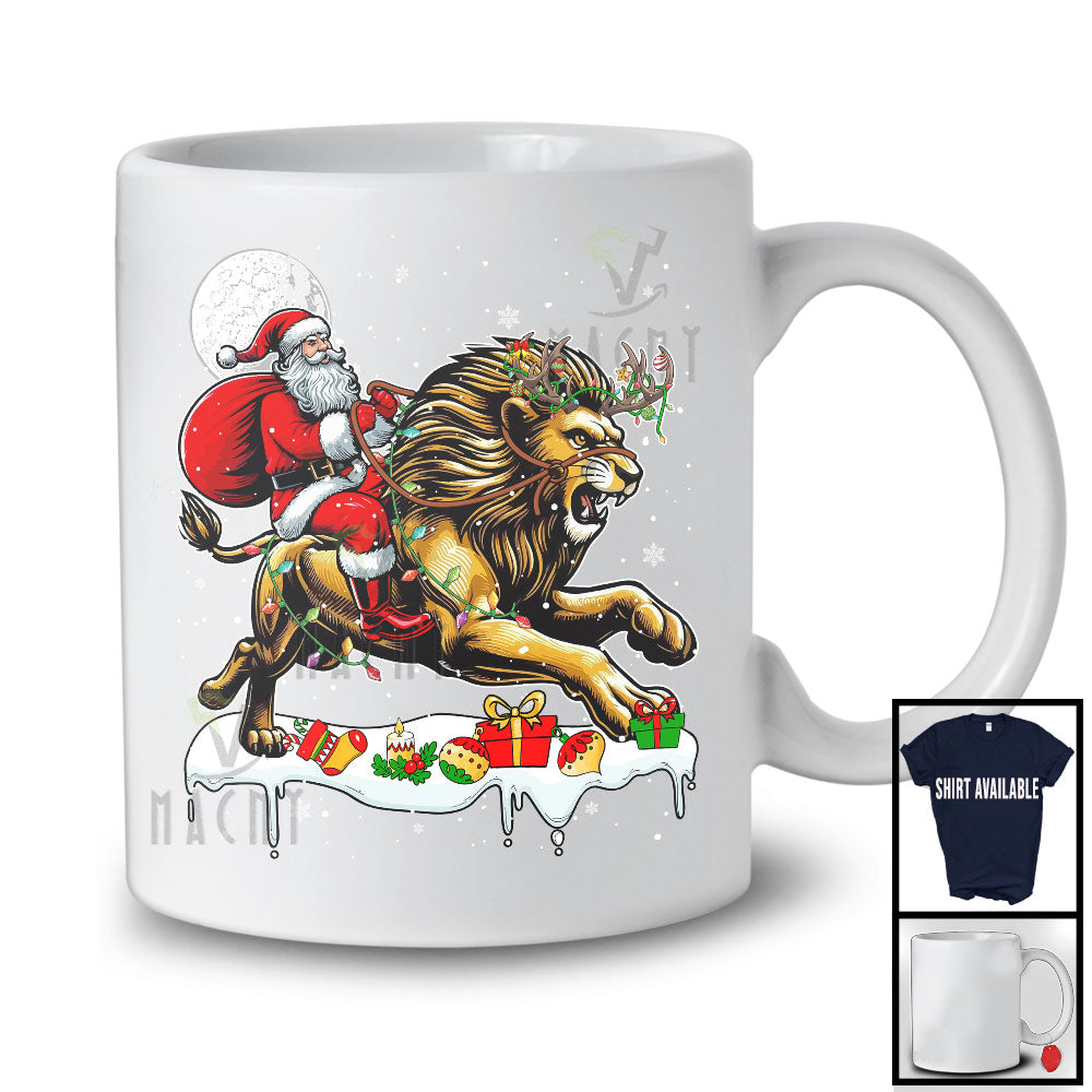 Santa Riding Lion Reindeer; Amusing Christmas Lights Santa Lion Animal; Snowing T-Shirt